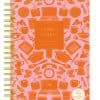 Features include elegant gold foil detail and gold effect metal wiro binding, all presented with a stylish design of orange household icons on a pink background. The A5 size makes it portable for any bag.
