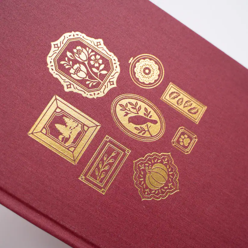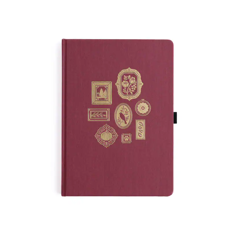 Elegant burgundy notebook with gold-foiled frame illustrations, perfect for journaling and creative writing at The Wraperie.