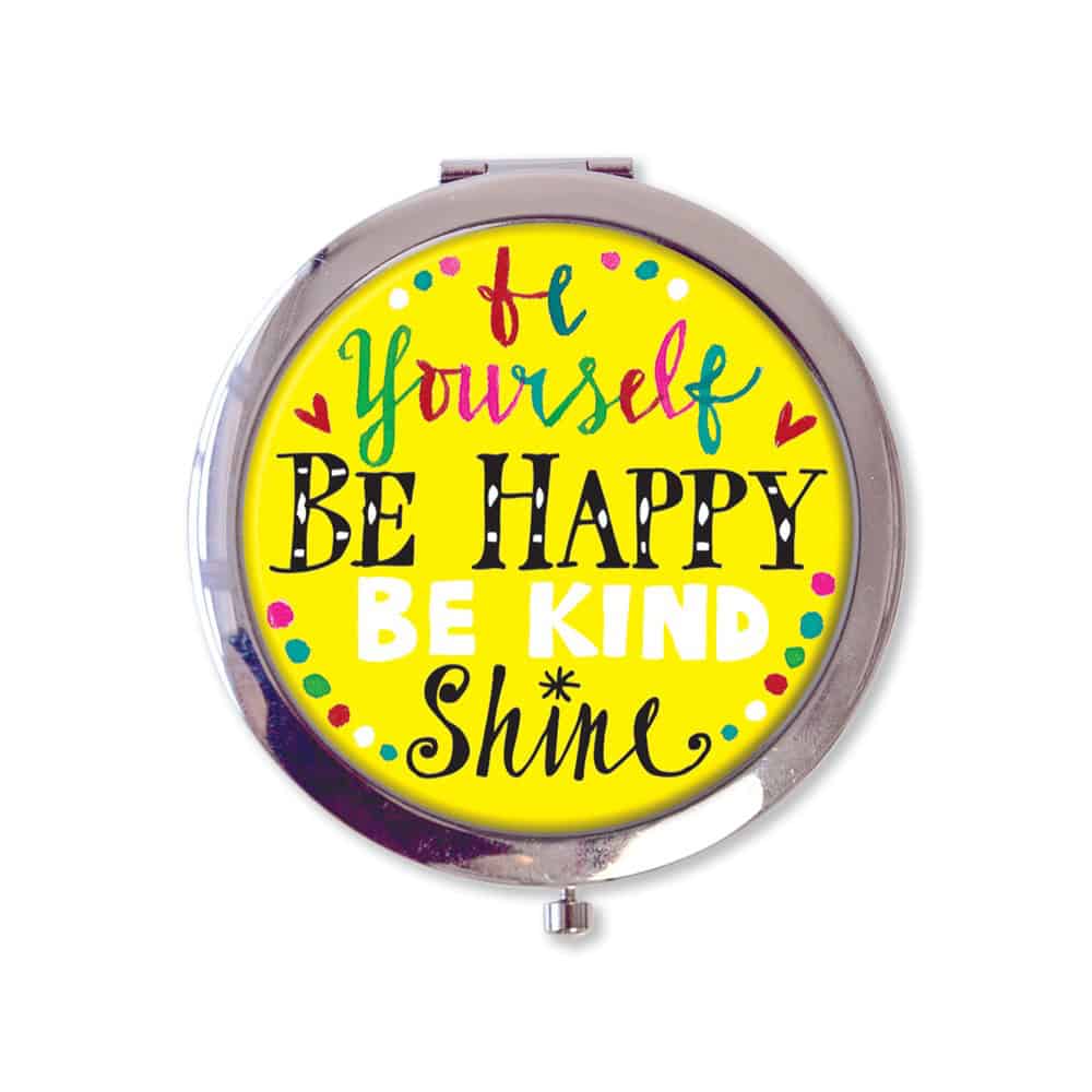 This cute ‘Be yourself, Be happy’ metal compact mirror has an easy push button opening and mirrors on both sides. An ideal handbag accessory, it is also packaged in an attractive gift box.