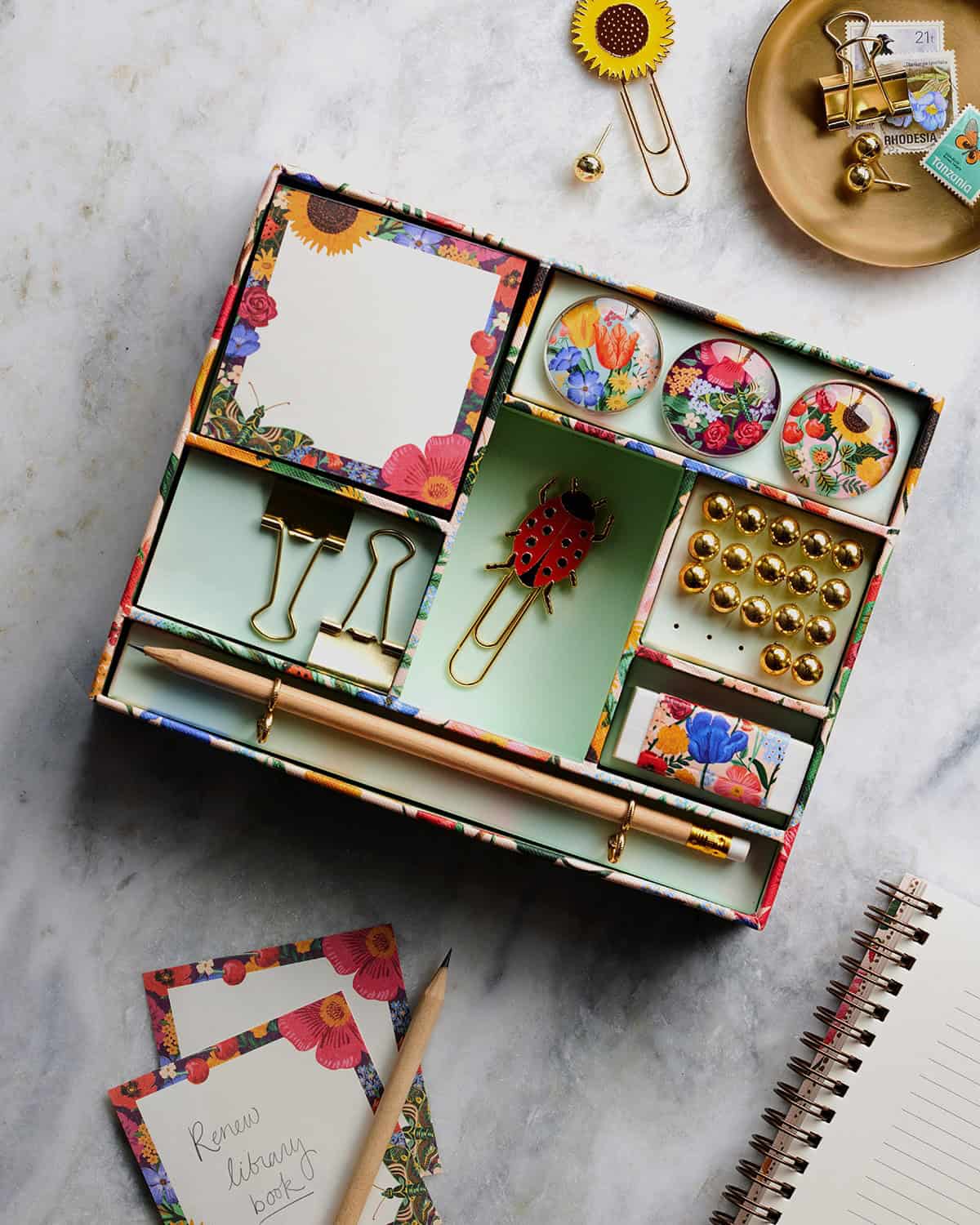 This tackle box includes all the little things you need to stay organized. The divided box is printed with a Blossom pattern, and comes filled with pencils, push pins, binder clips, paper clips, magnets, a sticky notepad, and an eraser.