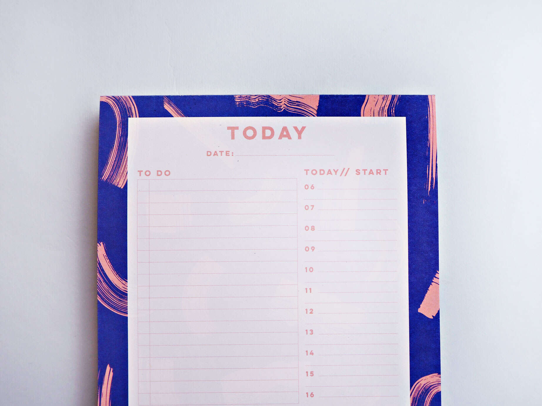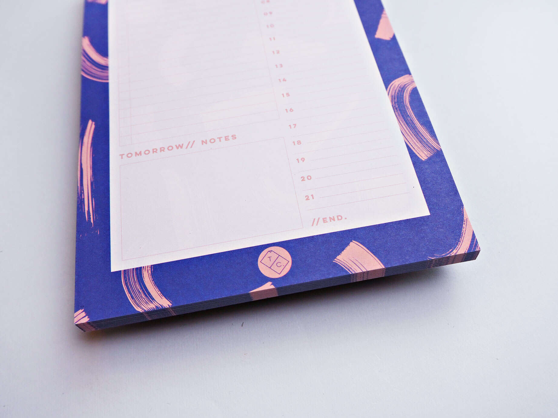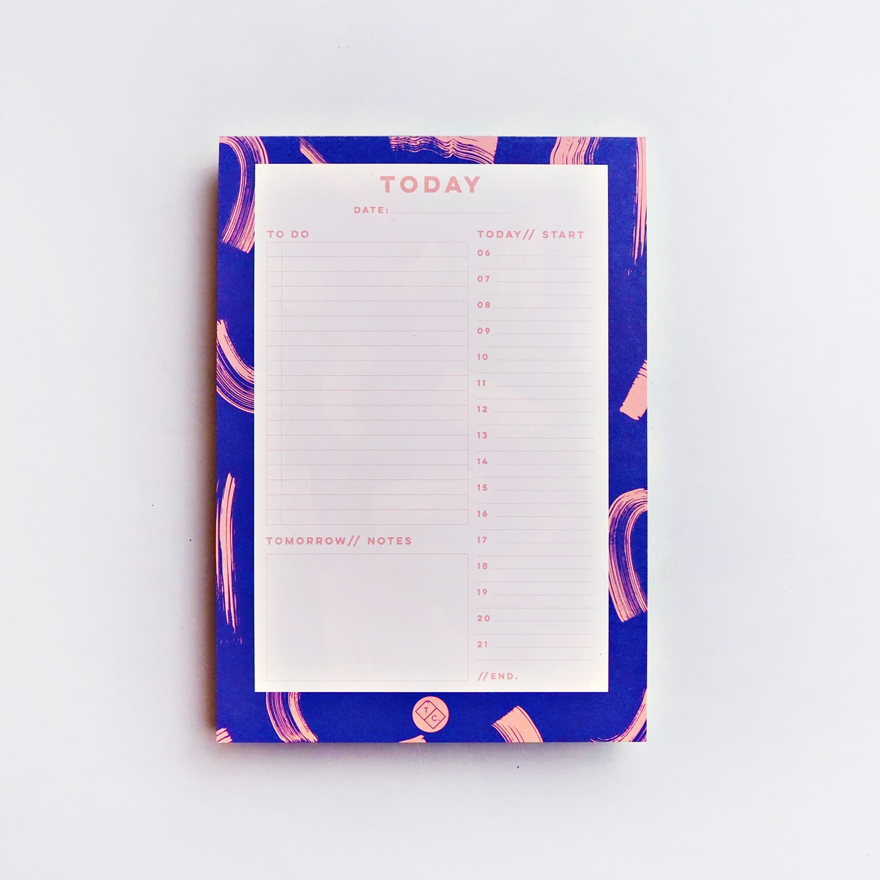 A daily planner pad featuring a blue shadow brush print and is organised into sections to help you plan out your whole day. • 50 pages