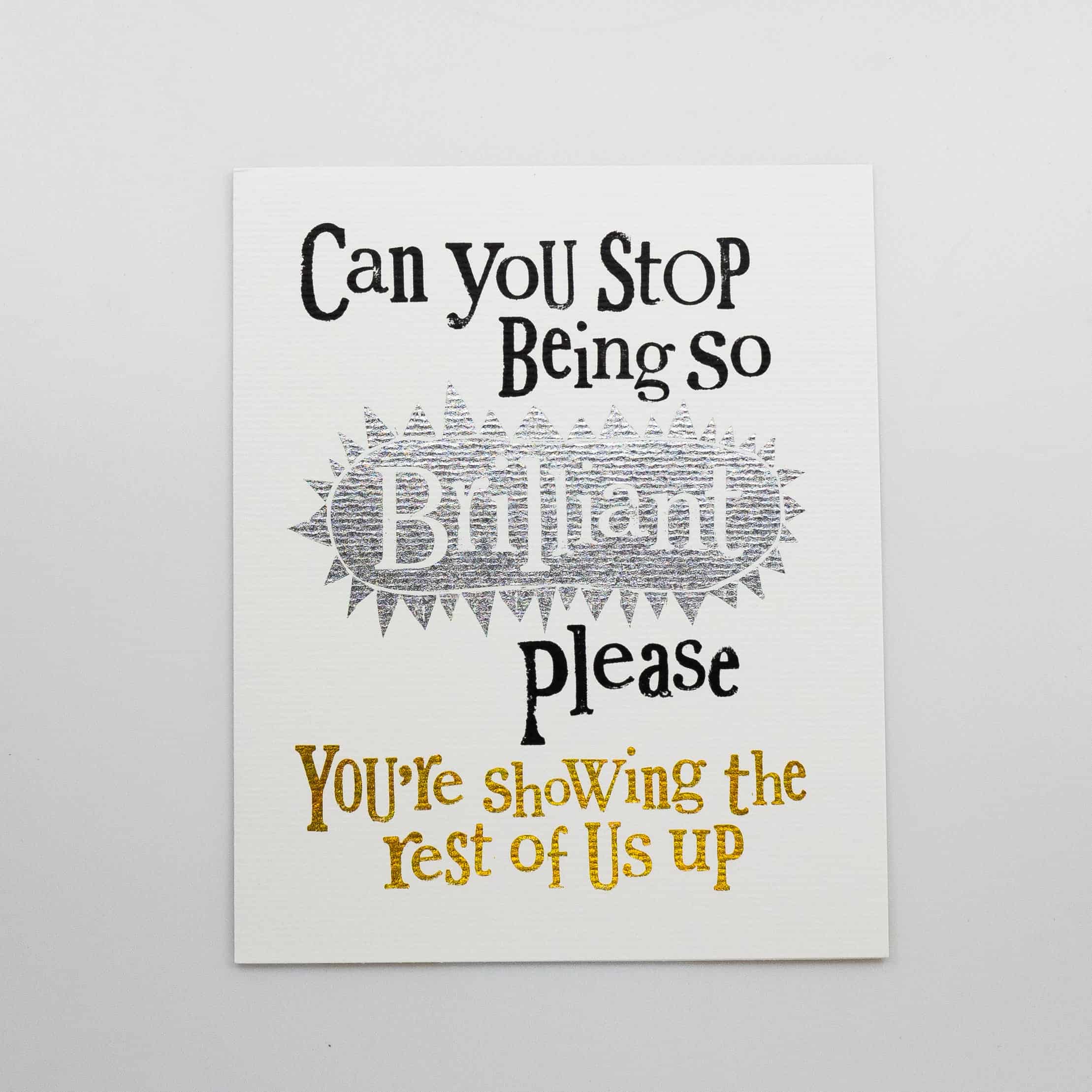 Card with foiling with message: Can you please stop being so brilliant you’re showing the rest of us up.