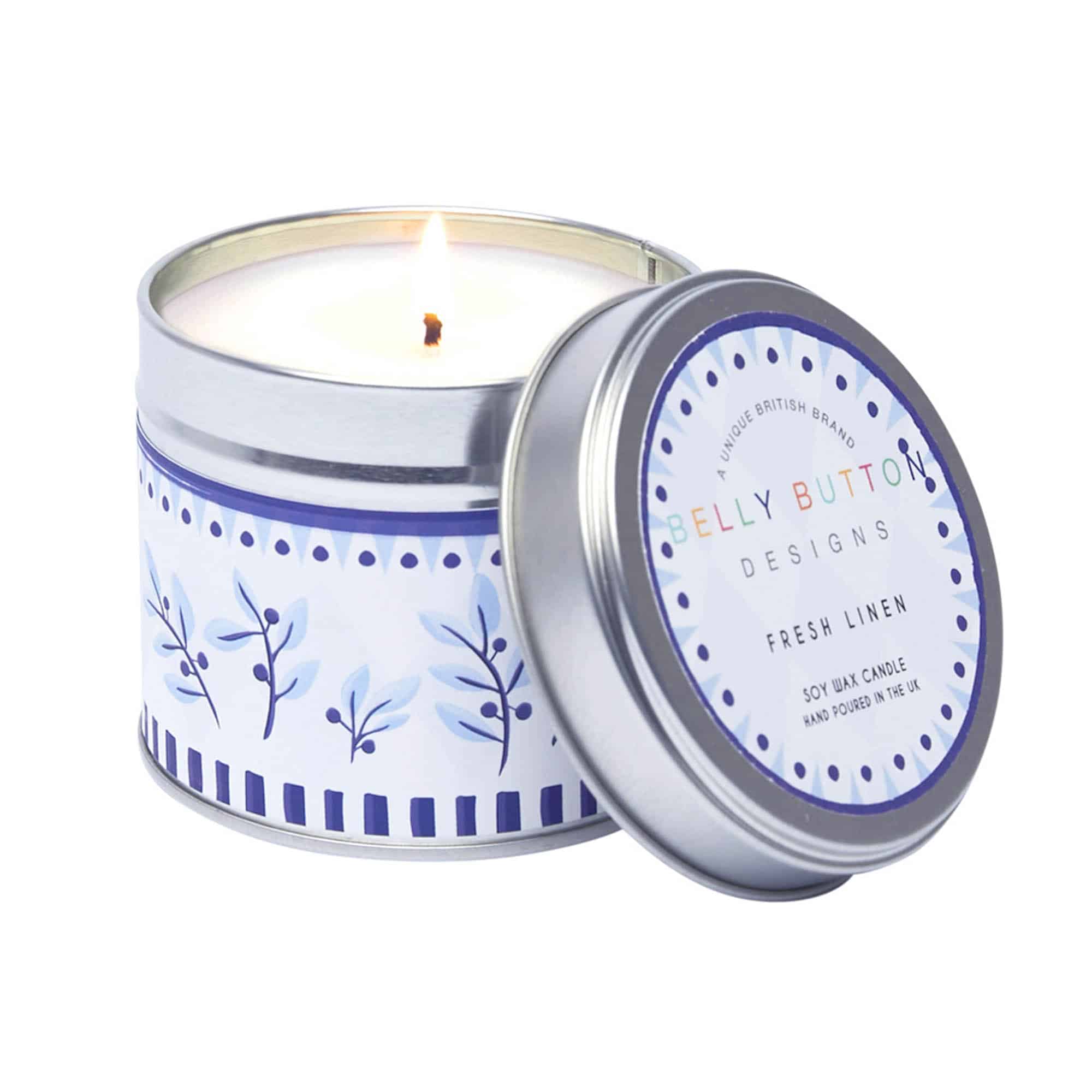 Soft linen scented soy wax candle in a decorative tin with floral design, perfect for home decor and relaxation.