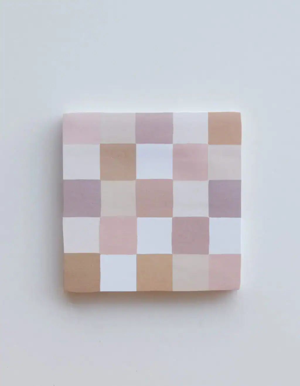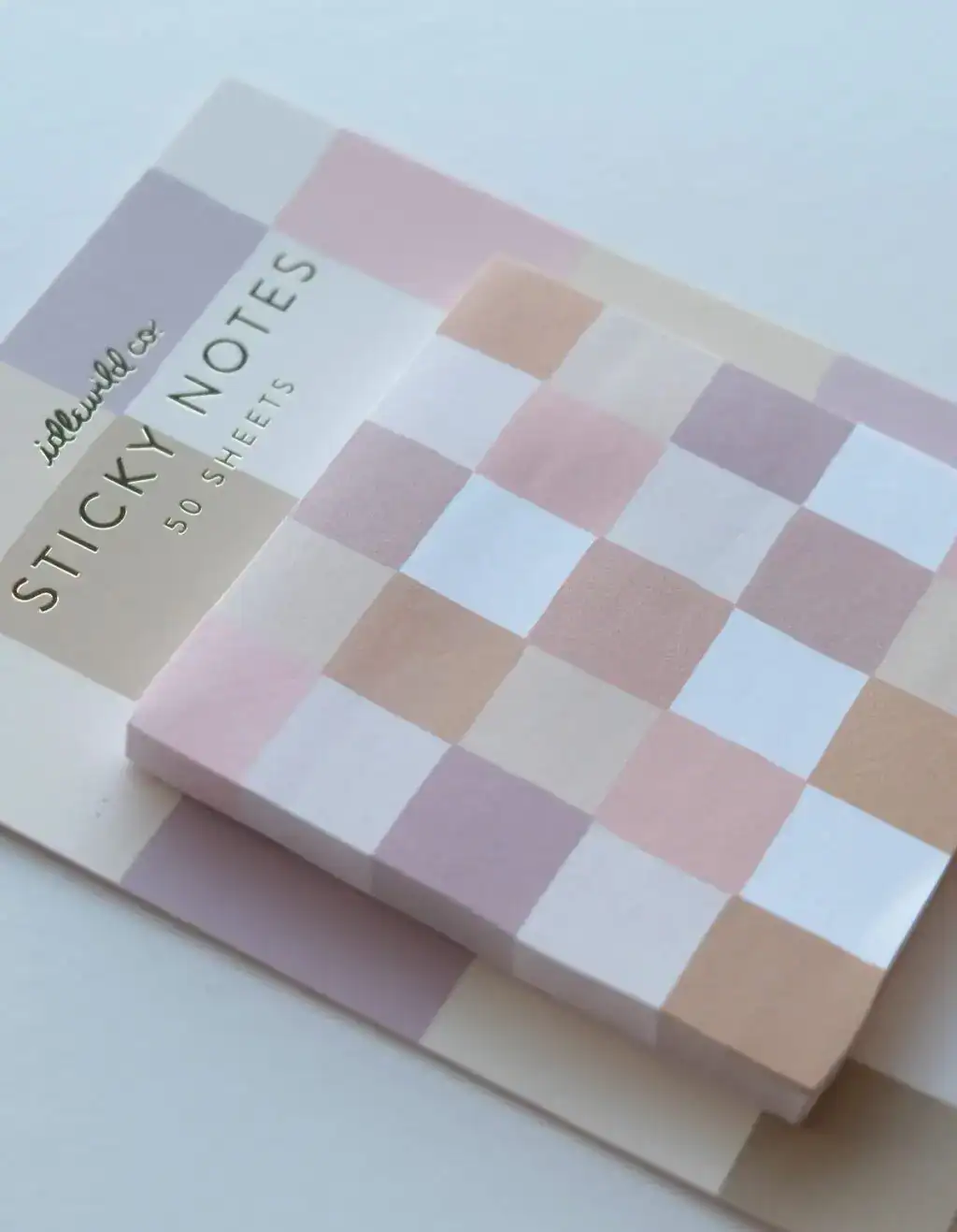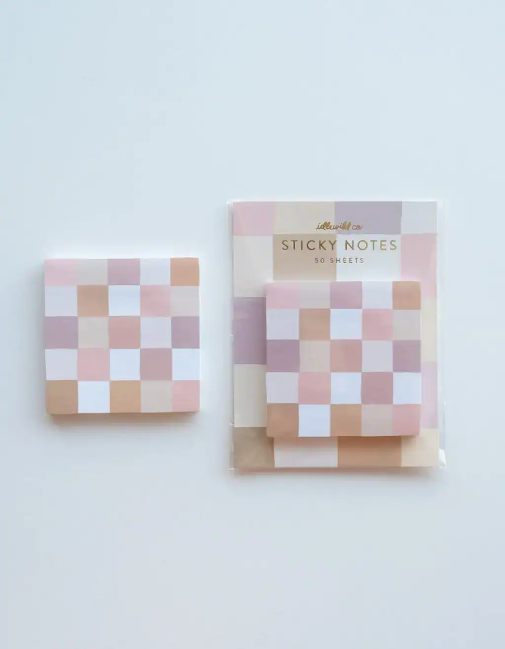 Pink and beige checkered sticky notes on white background, branded as The Wraperie.