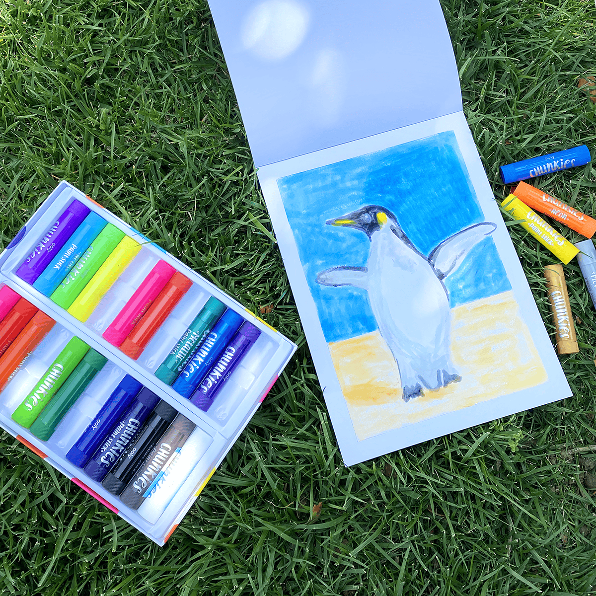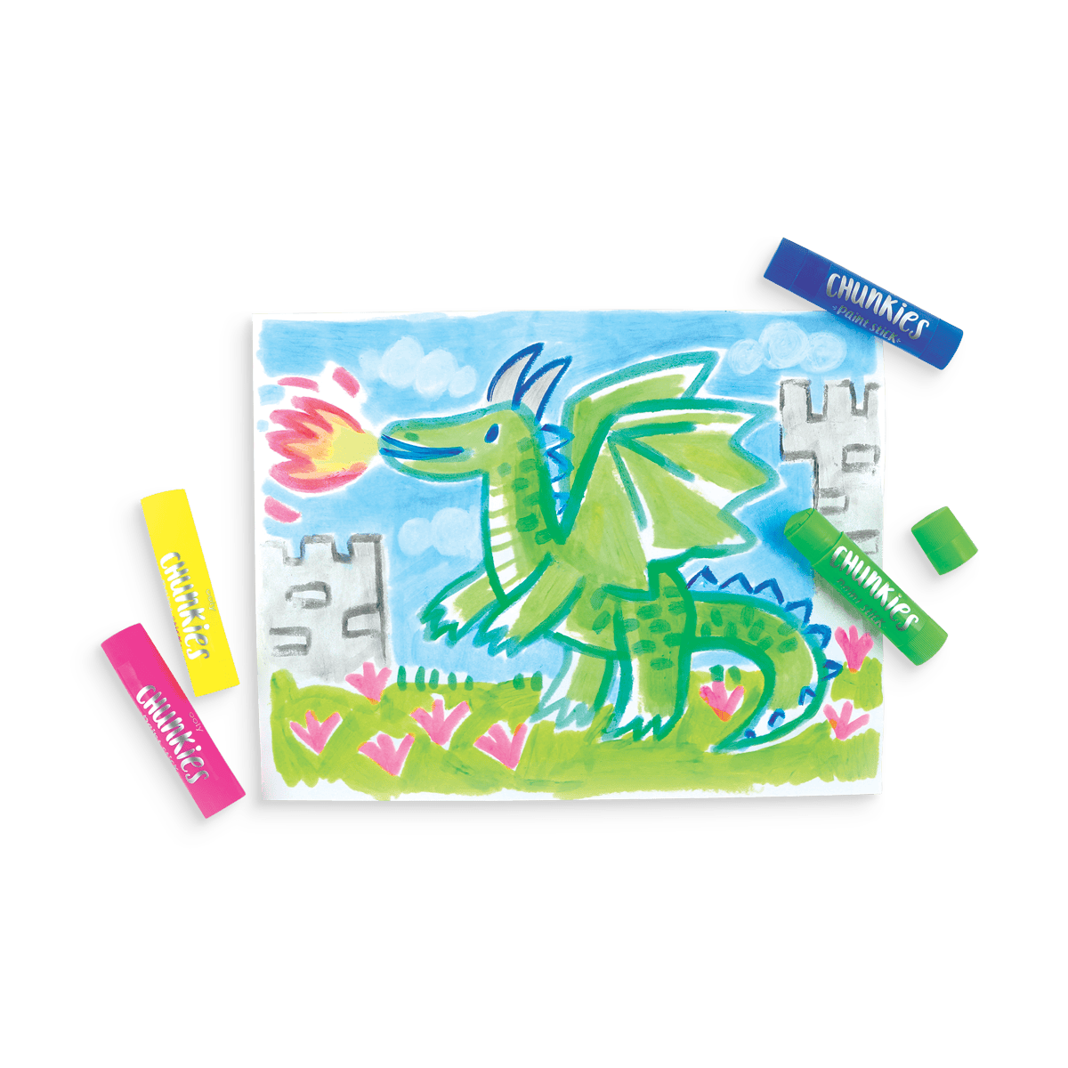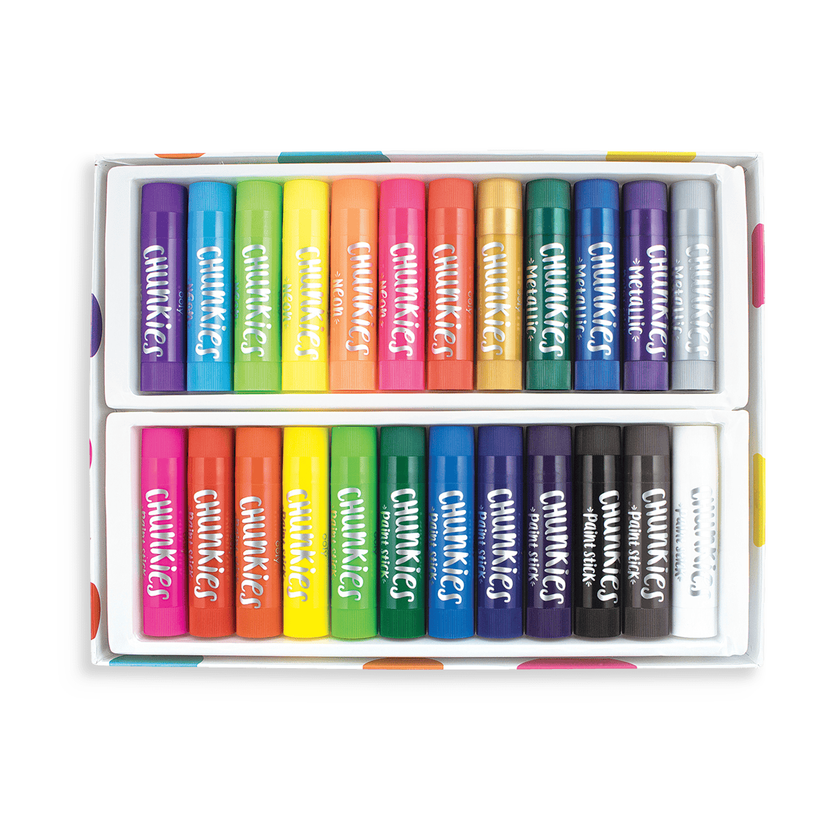 With easy to grip Chunkies Paint Sticks, kids have more control of keeping the paint on the paper and off the walls. The quick drying colors mean no more unintentional smudges, plus pictures are ready to hang almost instantly. The Chunkies Paint Sticks Variety Pack has 24 colored paints – 12 classic, 6 shiny metallics, and 6 pretty pastels. Care and use recommendations: Keep capped when not in use, to help prevent drying. Cover and protect your workspace. This product may stain some surfaces.