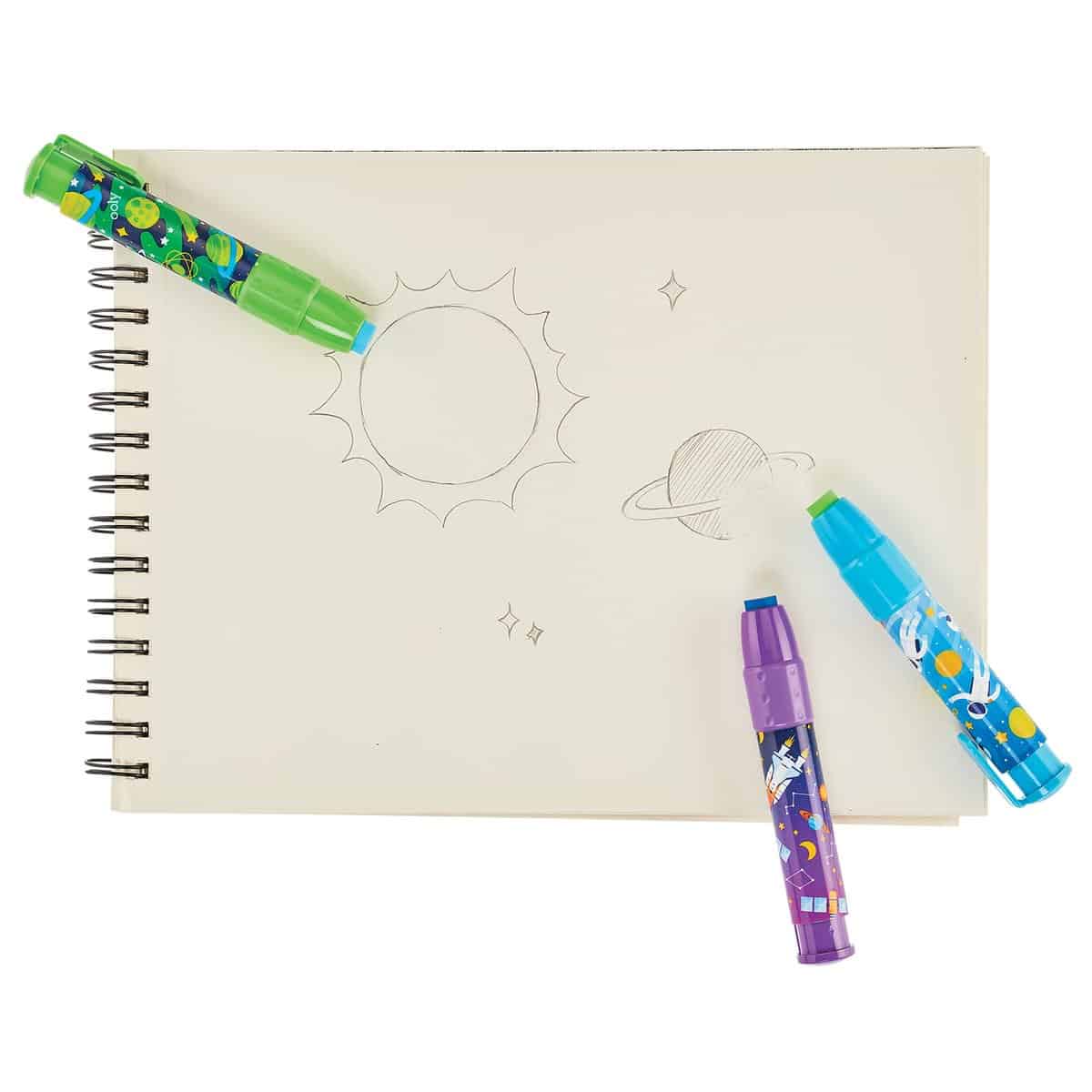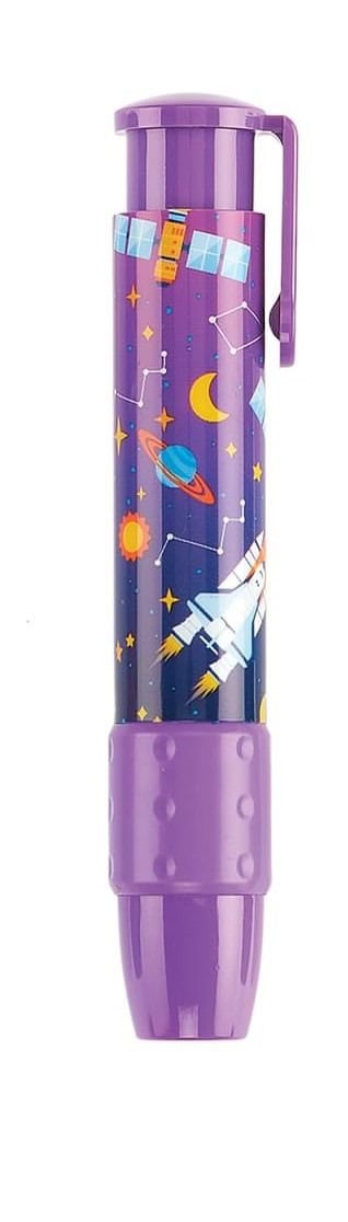 This click eraser is retractable. With just a couple of clicks you’ve got yourself a really big pencil eraser that’s housed in a plastic barrel that’s chock full of really fun space designs. Price shown is per piece.