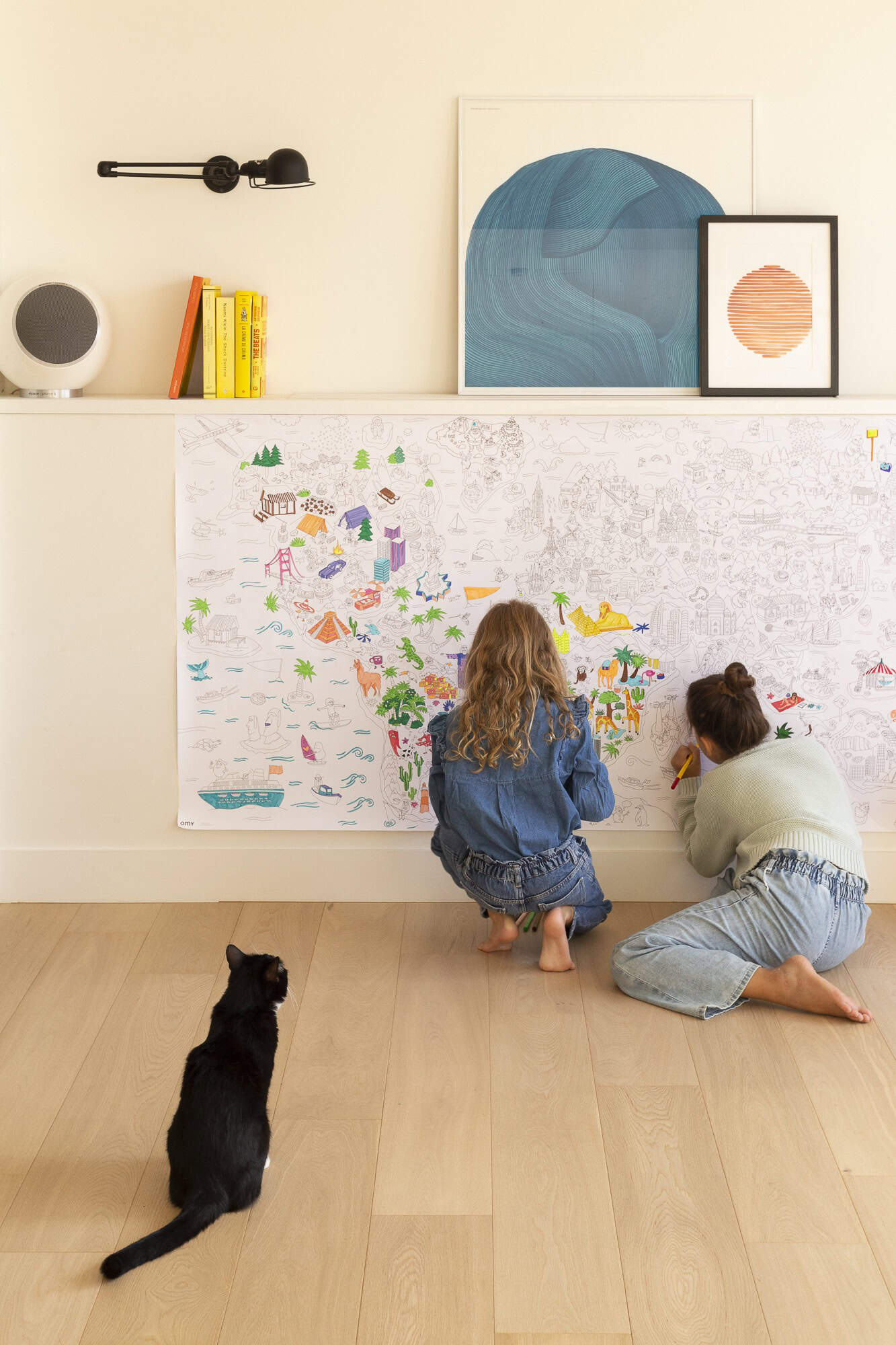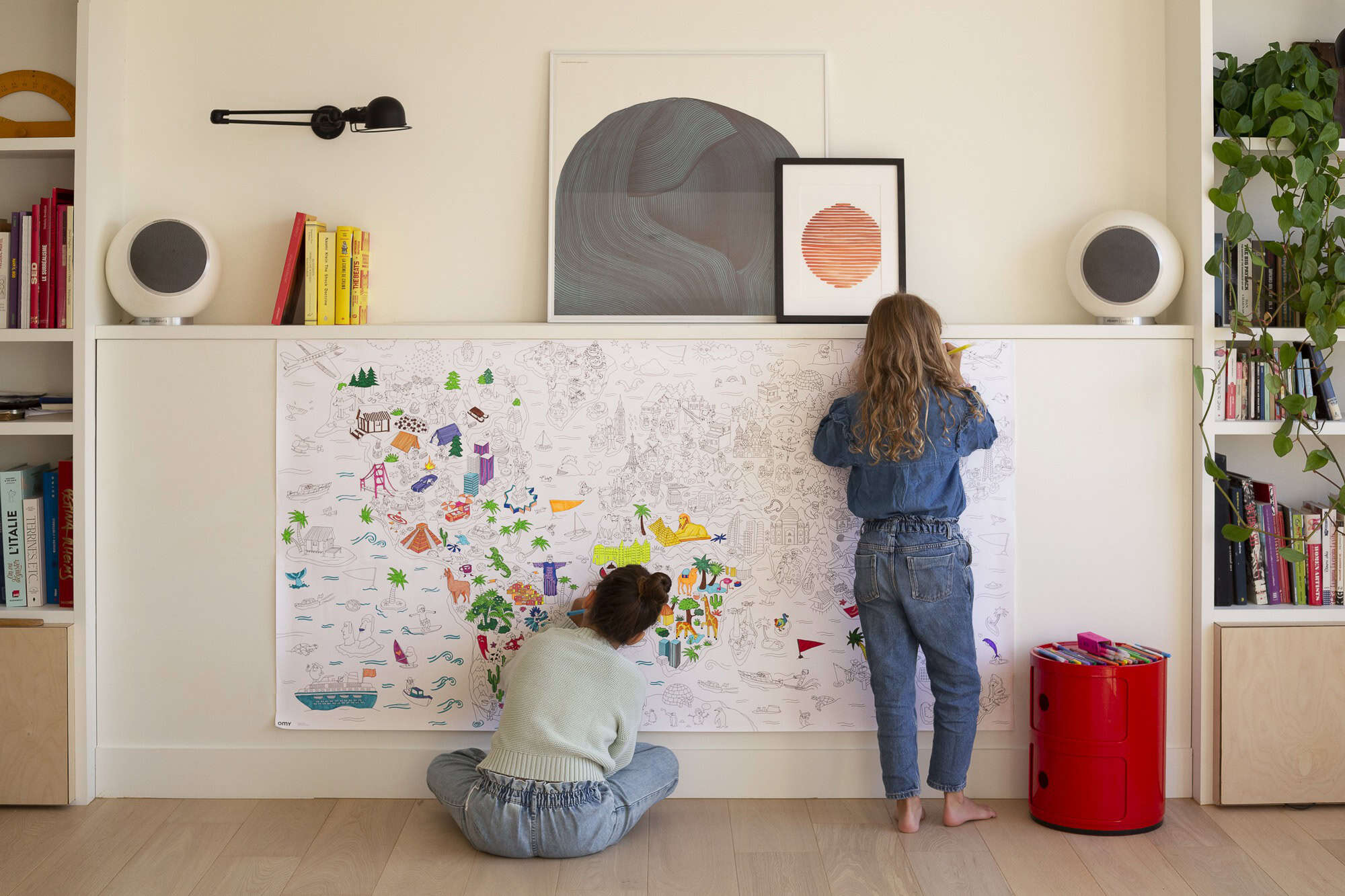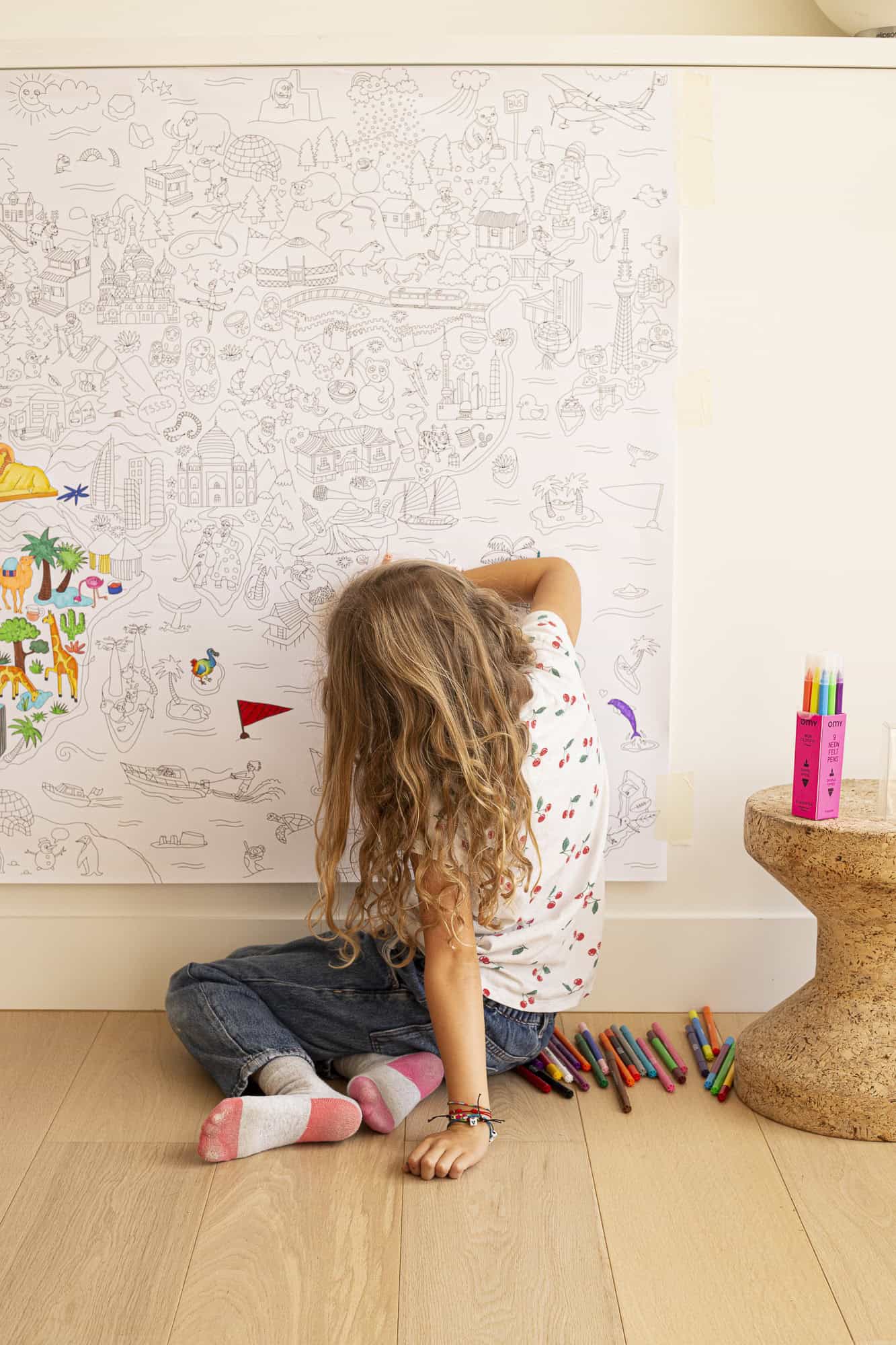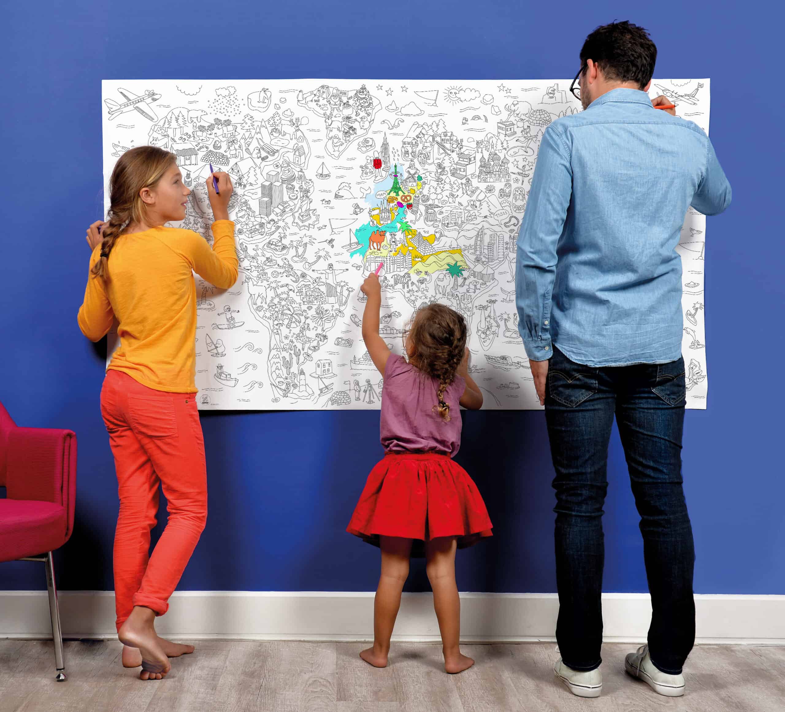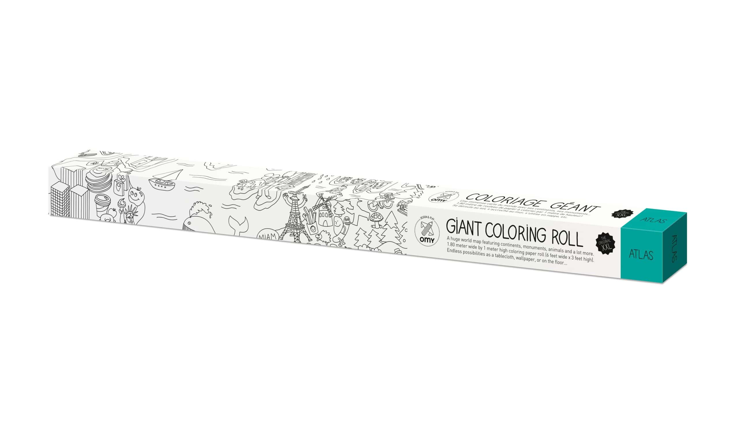 Gigantic map of the world to color to discover the world while having fun: the pyramids of Egypt, the Statue of Liberty, Brazil, the Eskimos, the statues of Easter Island. A line full of humor and a multitude of details, a real graphic journey to share between all generations. A limitless artistic space to color alone or with others, to be rolled out on the floor, hung on the wall or used as a tablecloth. Contents 1 poster. Designed and made in France by OMY. Instructions: Use 2 to 4 boxes of felt-tip pens OMY to complete your entire poster!