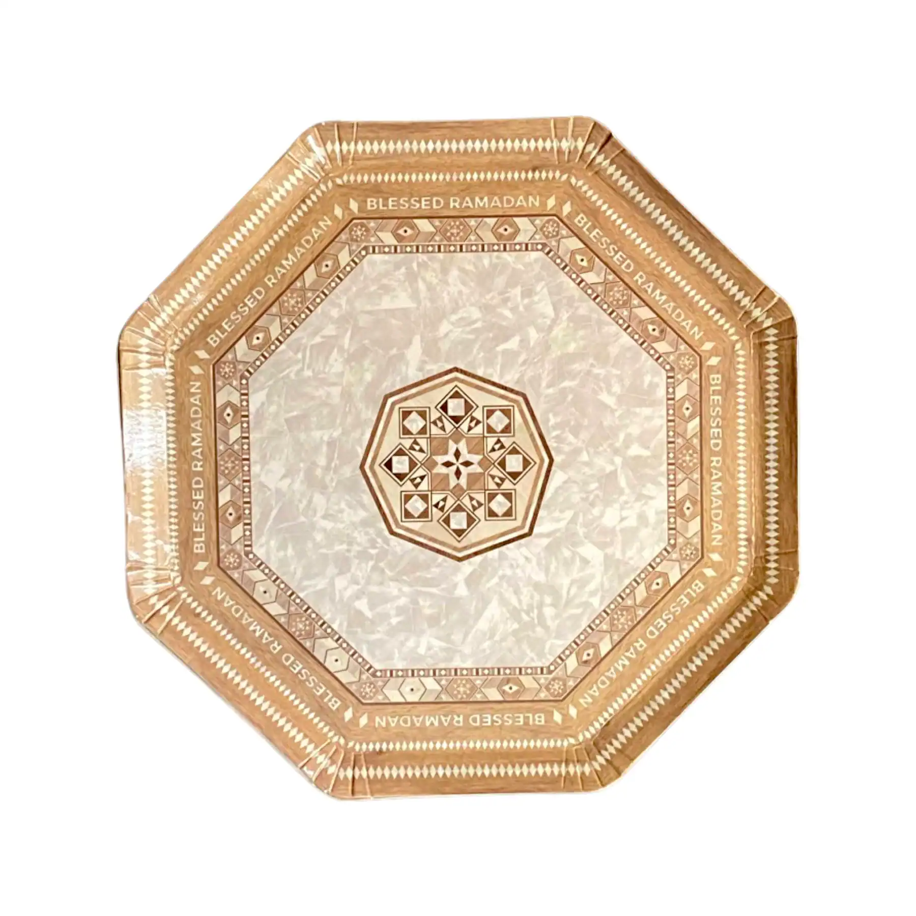 Set of 8 paper dessert plates, with Syrian mother of pearl print and text “Blessed Ramadhan”.