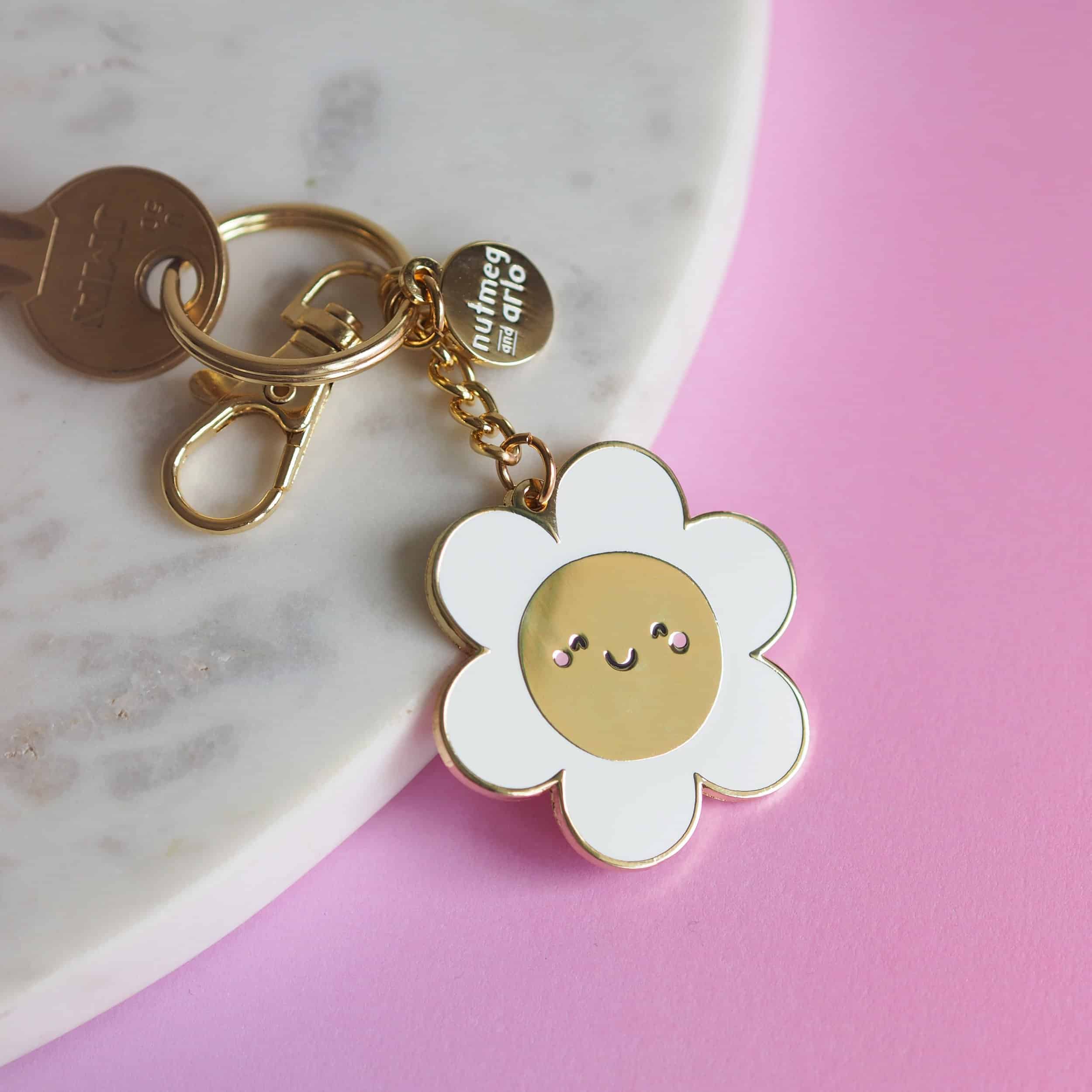 This luxury hard enamel gold keychain measures approx 45mm x 42mm. It has a 25mm gold keyring attachment with lobster clasp (ideal for adding on trolley coins!) and comes with a Nutmeg and Arlo gold tag.