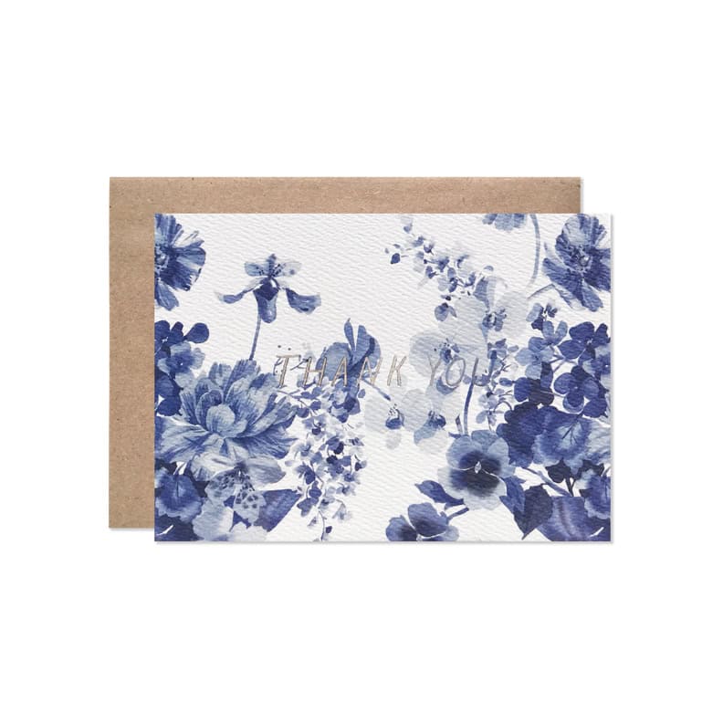 Dealtry x HB is a collaboration between Helen Dealtry, a painter known for her breathtakingly beautiful florals and Emily Johnson, founder of Hartland Brooklyn and an illustrator/letterer who’s been designing artistically-unique greeting cards since 2012; both are residents of the Hudson Valley in New York. Card with indigo florals illuminated by metallic silver “Thank You.”