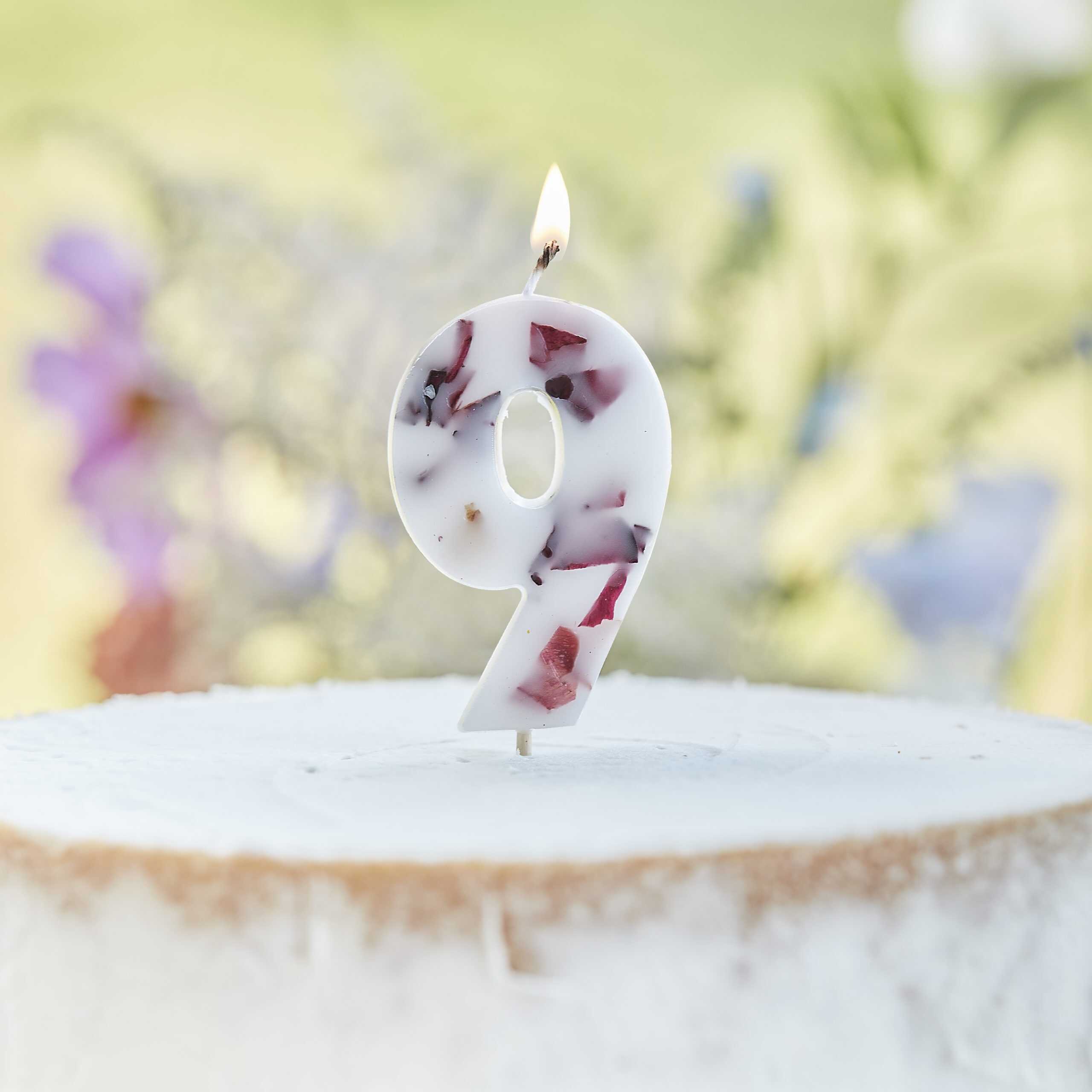 White number 9 candle with natural pressed petals