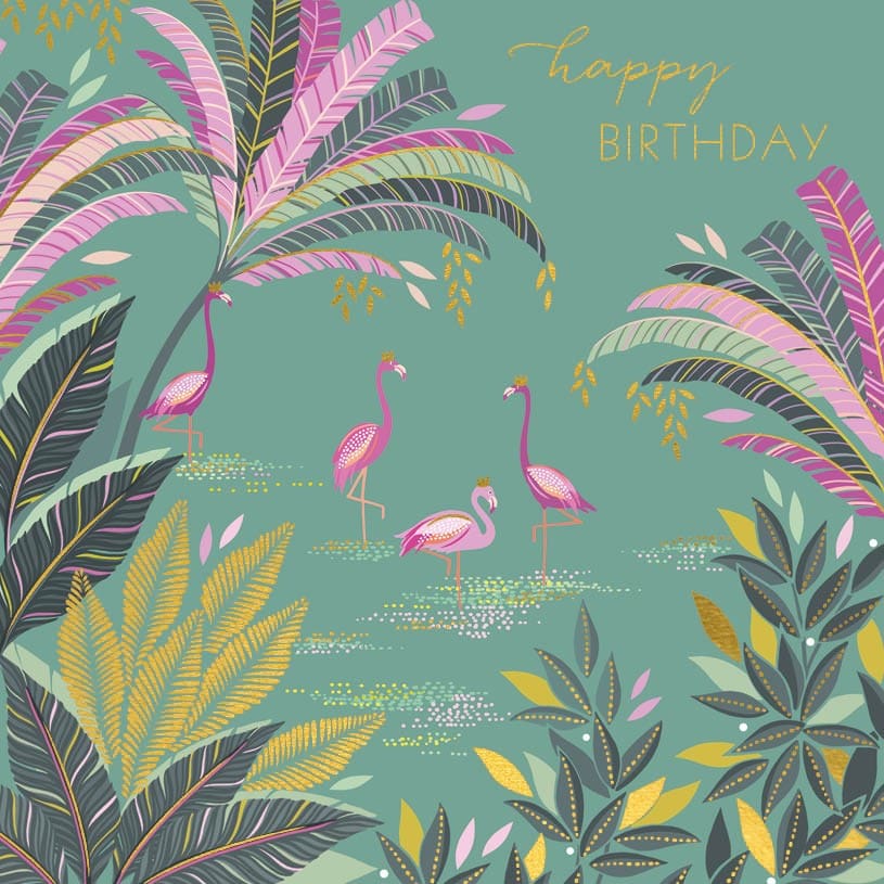 Flamingos & palms happy birthday Sara Miller card