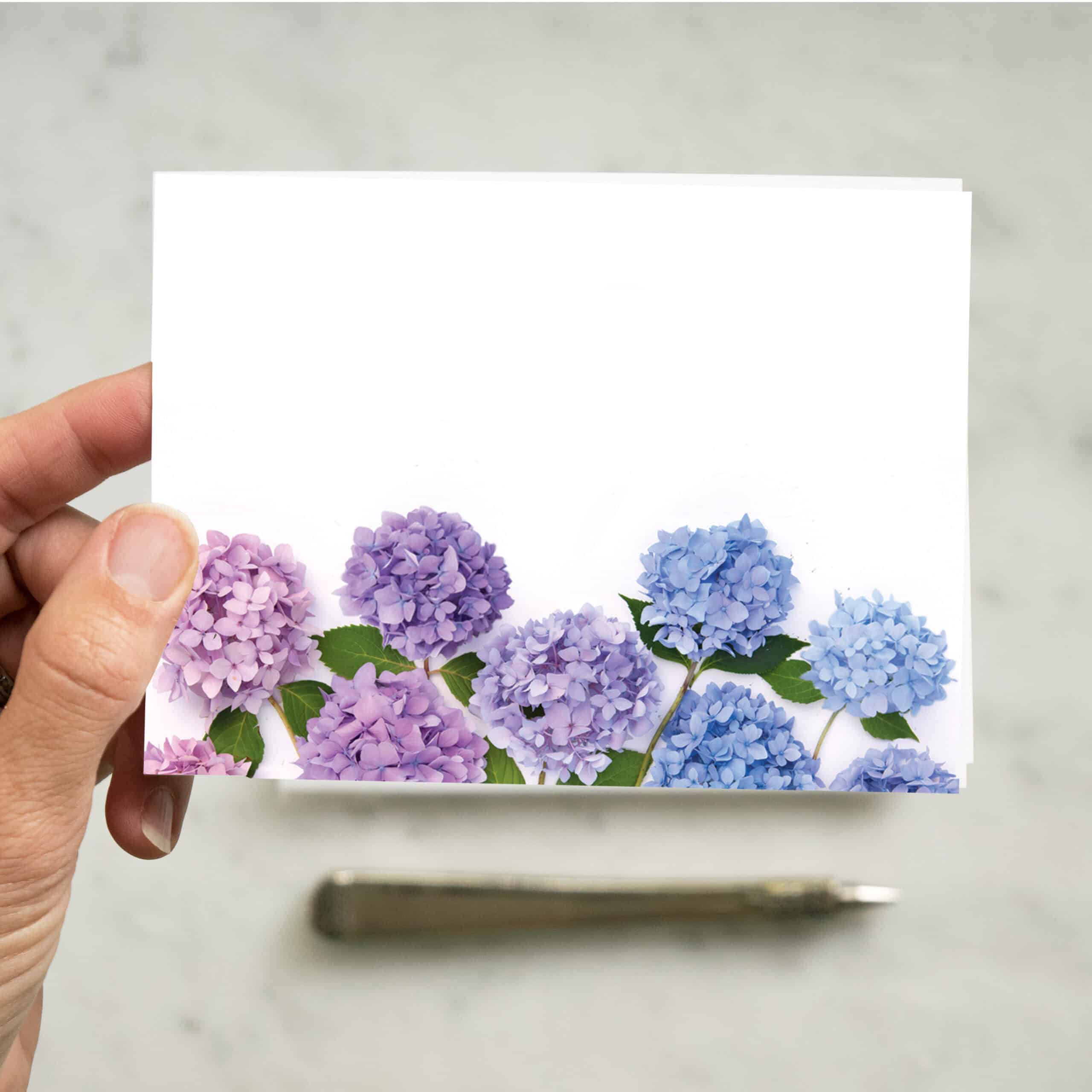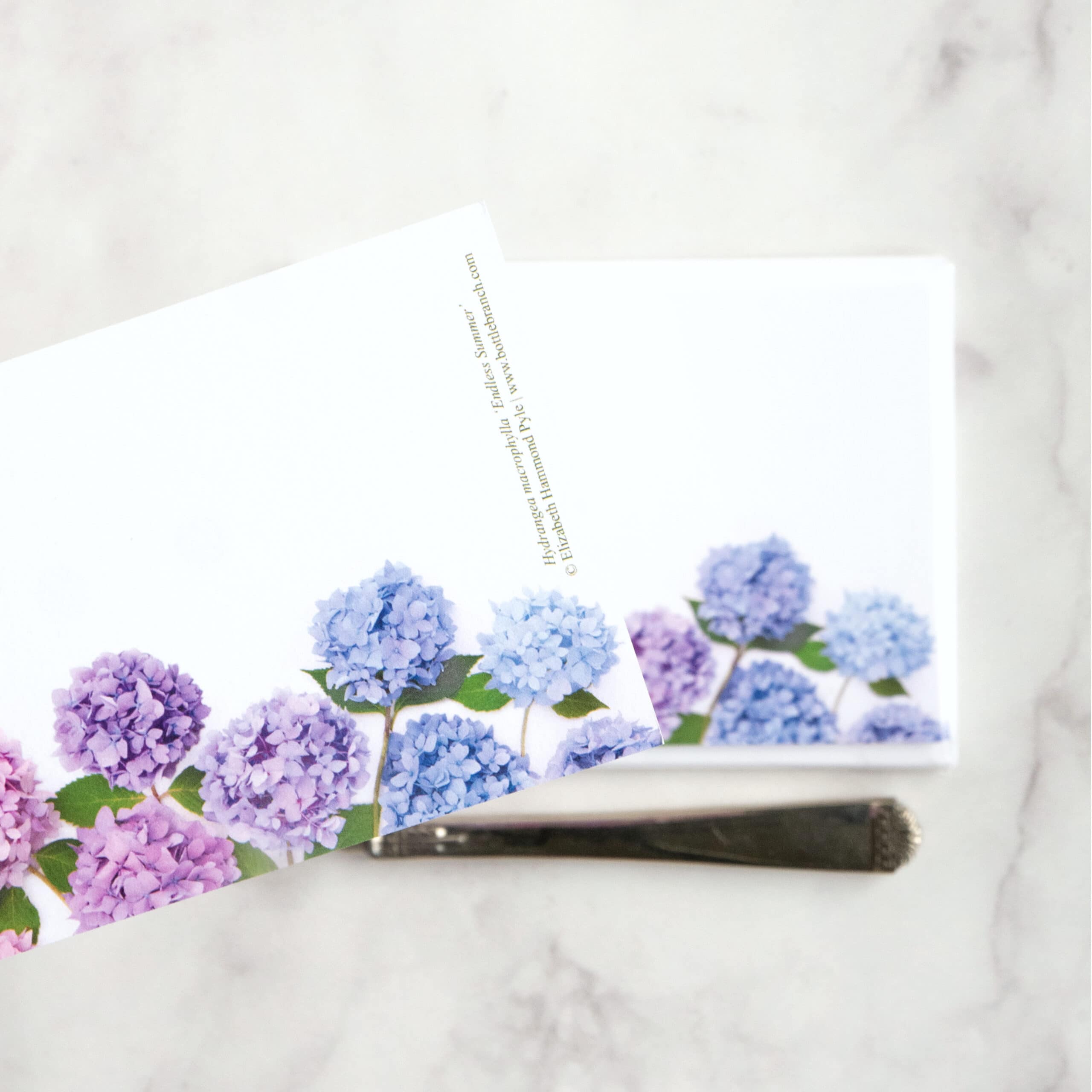 Set of eight flat botanical cards featuring hydrangea flowers in shades from pink to purple to blue. Printed on an appealingly soft and hefty card stock. Flat, not folding, design is perfect for the quick, casual notes. Rear caption lists plants depicted. Forest Stewardship Council certified. Acid free. Size A2. Packaged sustainably in plant-based, compostable PLA cello envelope.