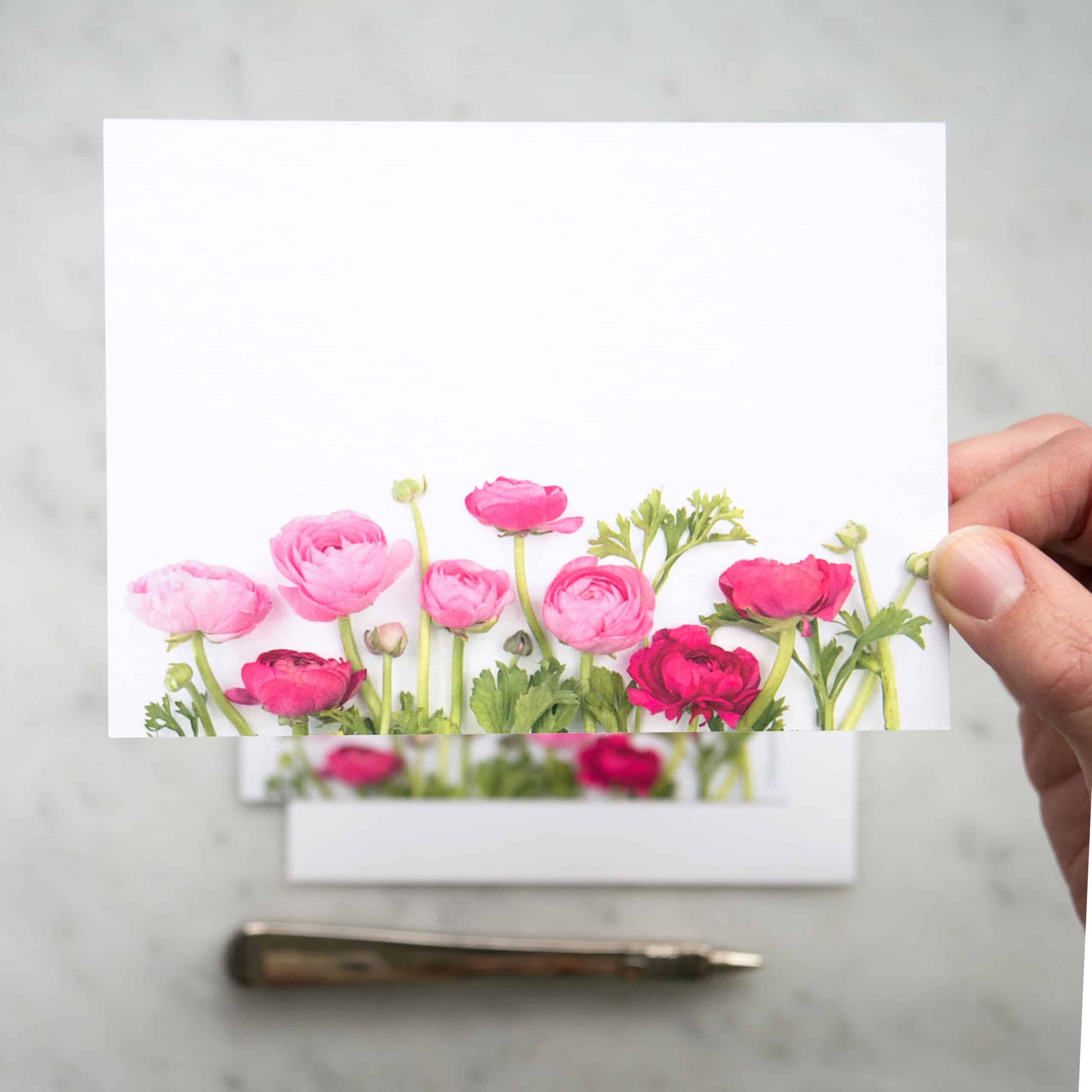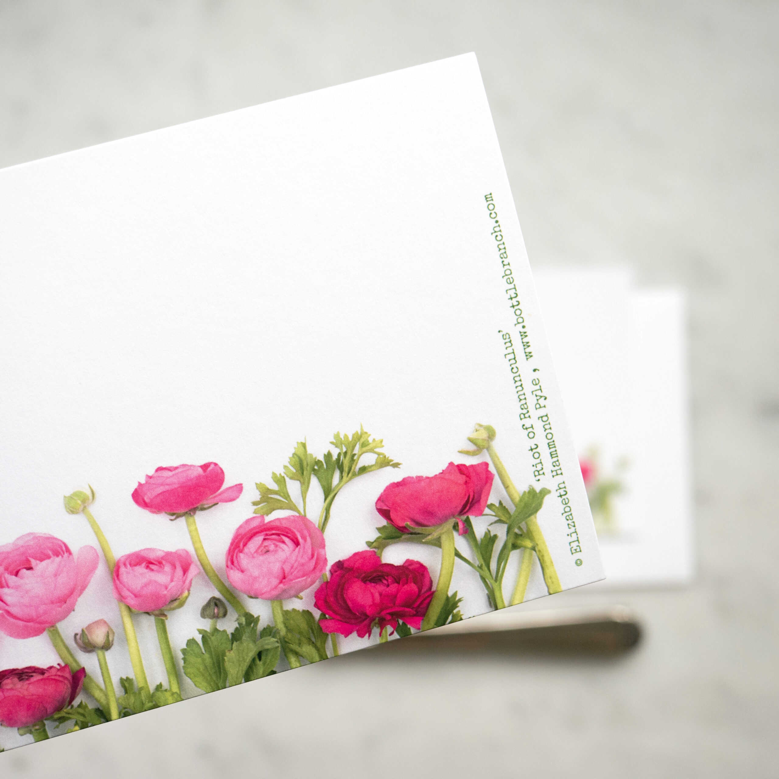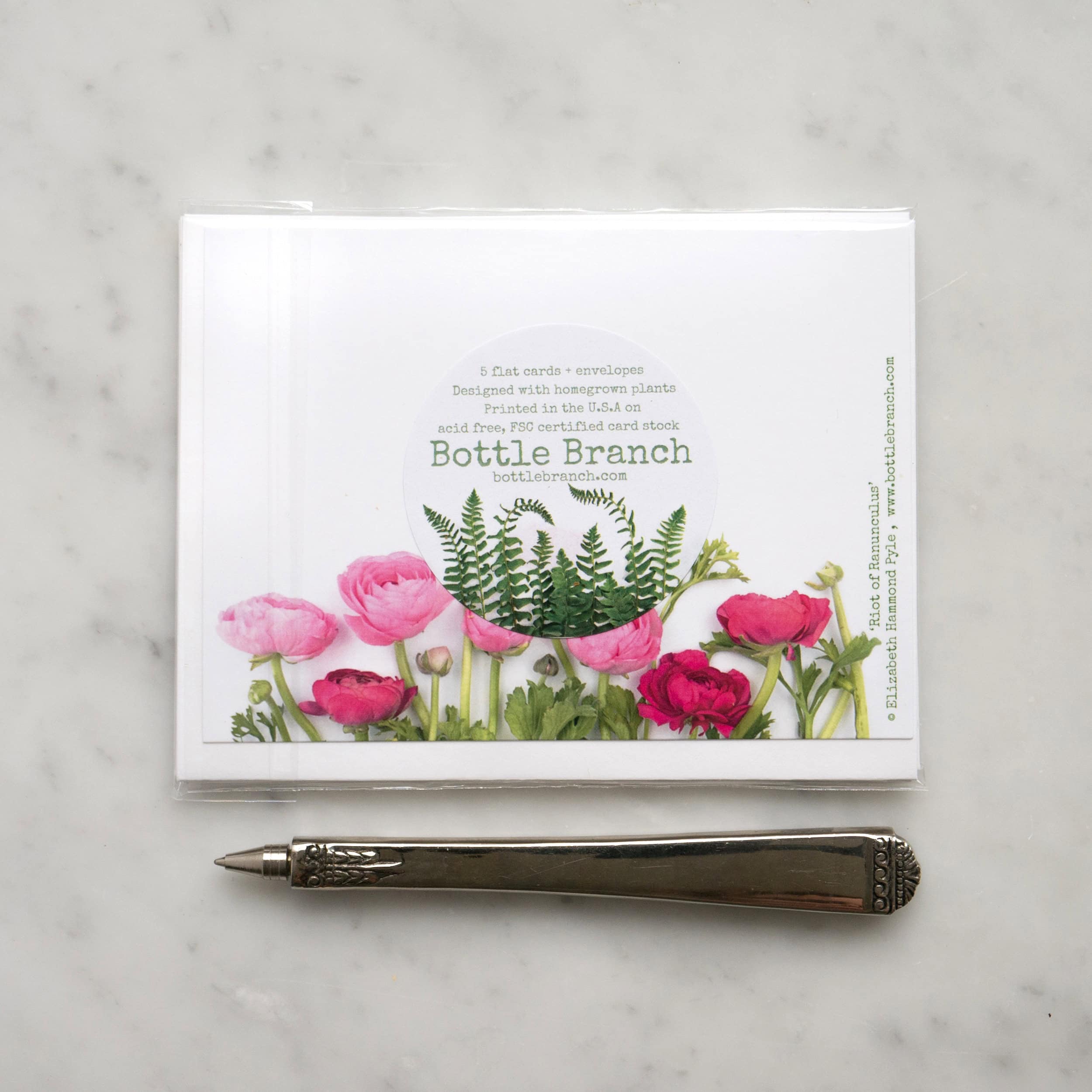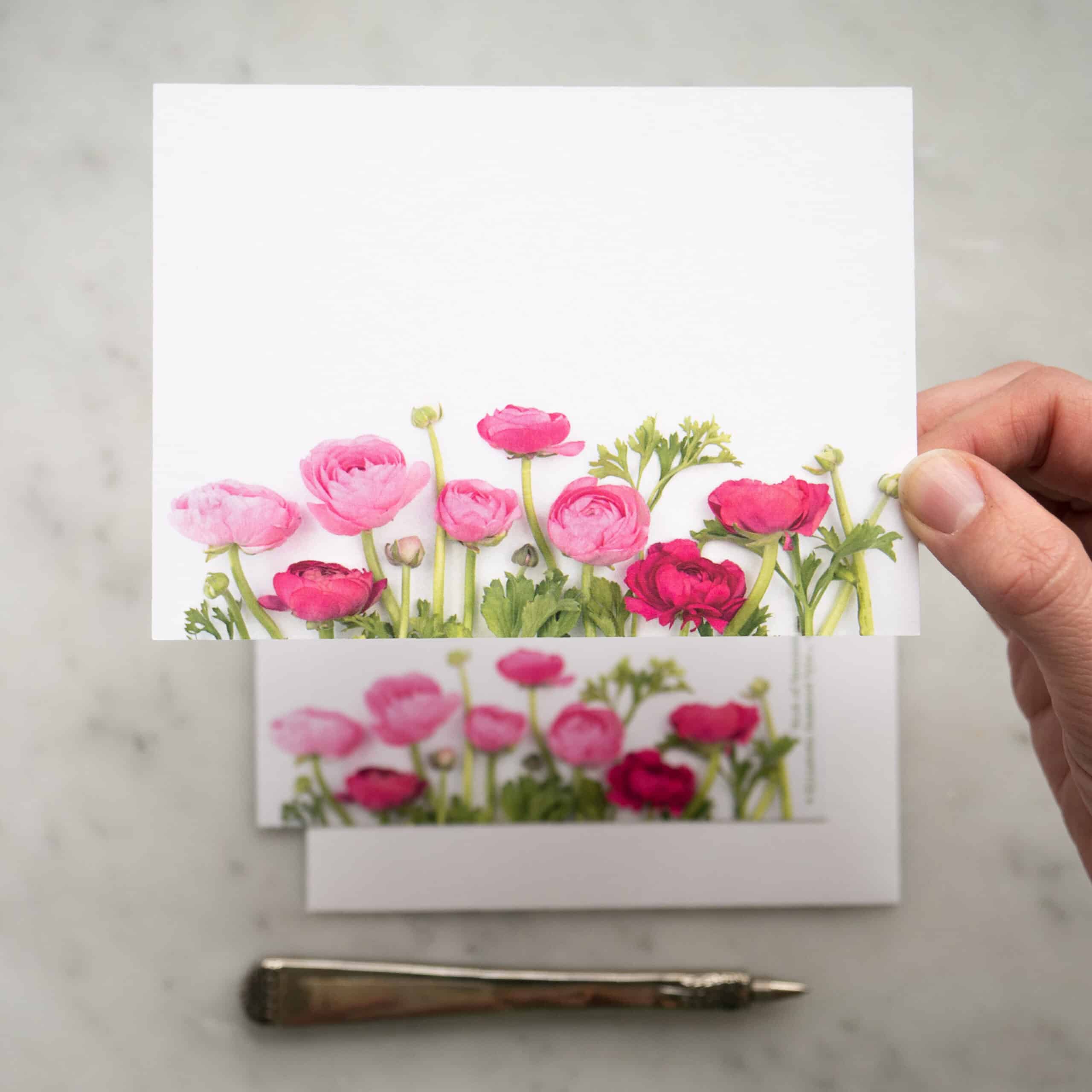 Set of eight flat botanical cards featuring ranunculus flowers. Printed on an appealingly soft and hefty card stock. Flat, not folding, design is perfect for the quick, casual notes. Rear caption lists plants depicted. Forest Stewardship Council certified. Acid free. Size A2 (4.25″ x 5.5″). Packaged sustainably in plant-based, compostable PLA cello