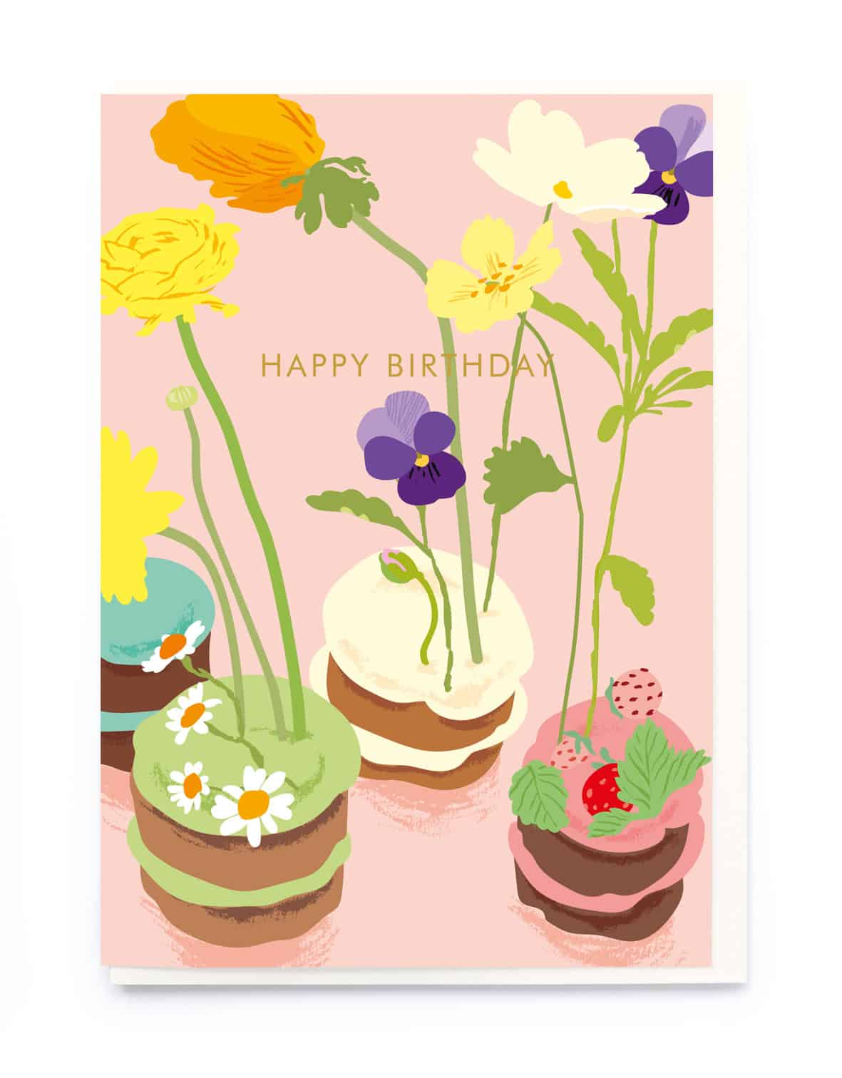 Flower cakes ‘Happy Birthday’ gold foil message. Blank inside and supplied with an off white envelope. Designed and printed in the UK