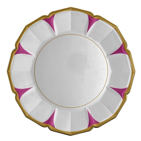 Add a little whimsy to your party with these fuchsia daisy dinner plates. These porcelain inspired plates feature a white daisy with fuchsia accents and a gold scalloped edge.