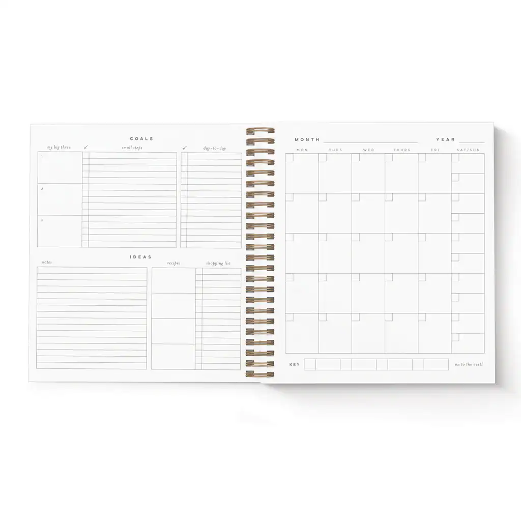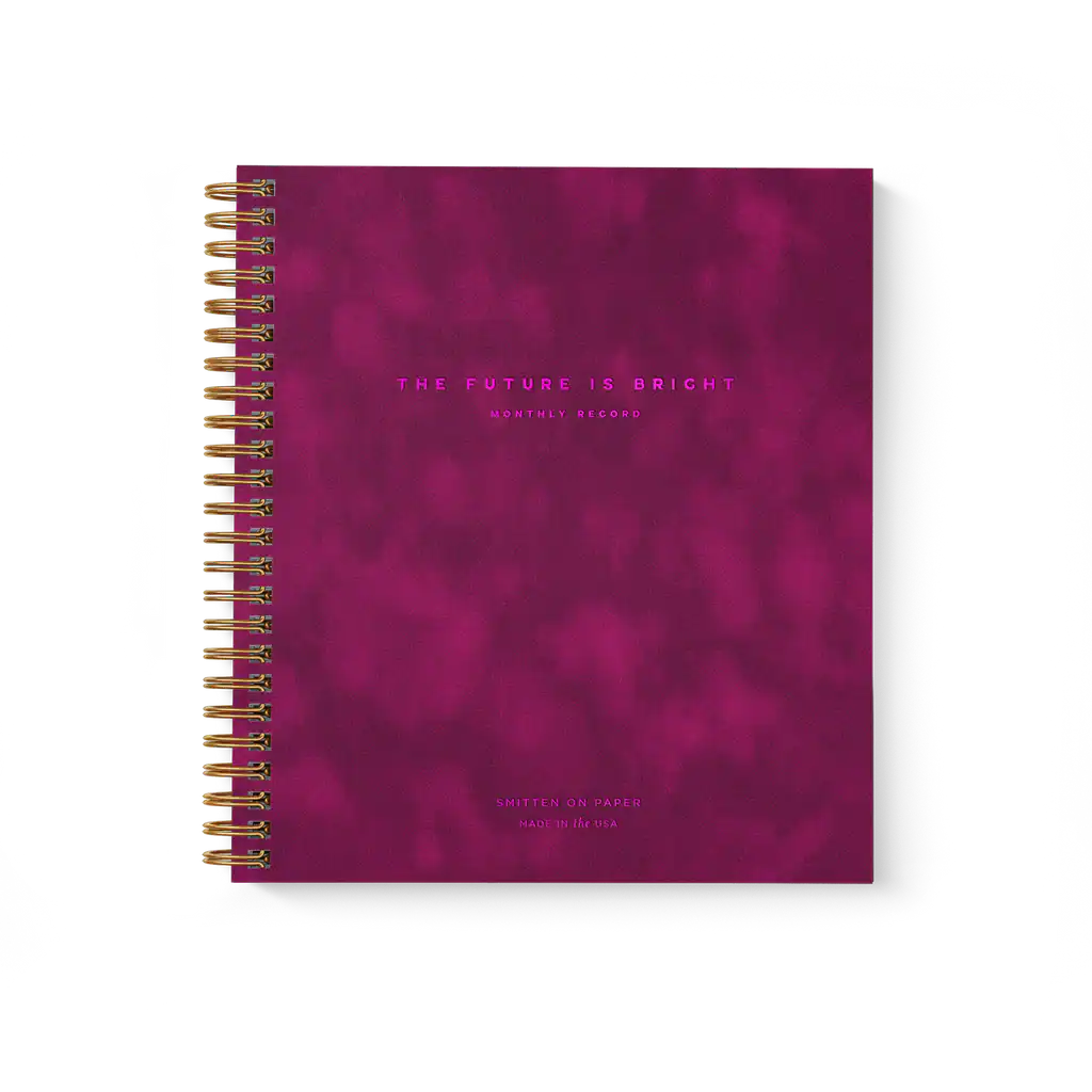 Our The Future is Bright Monthly Planner is an undated monthly planning calendar printed with gold foil stamping on the cover and pale gray digital ink on heavyweight cardstock. With fill-in monthly pages alongside weekly tasks, goals, and milestone tracking pages, this planner is the best way to get a bird’s eye view of your month.