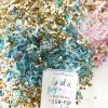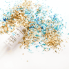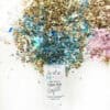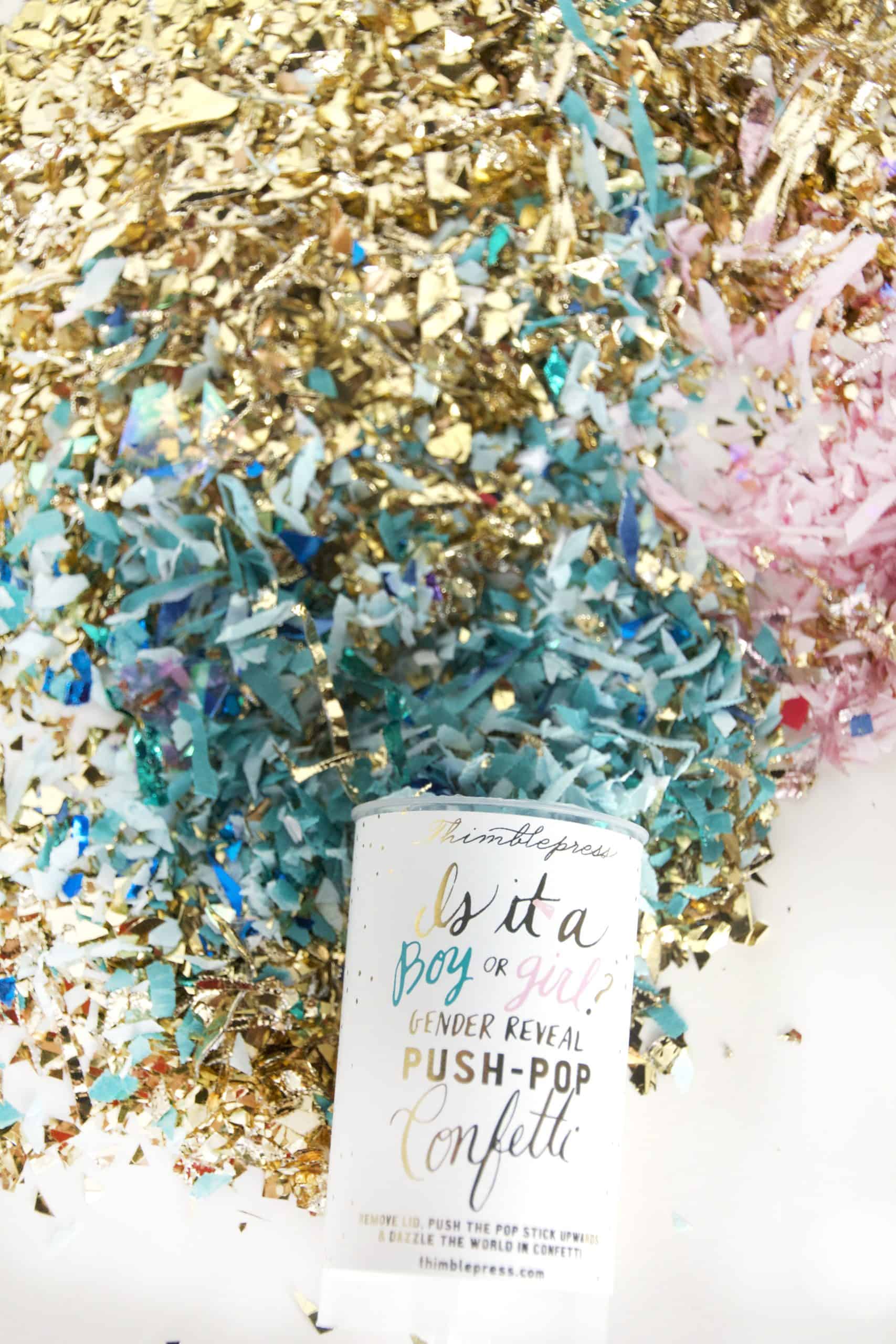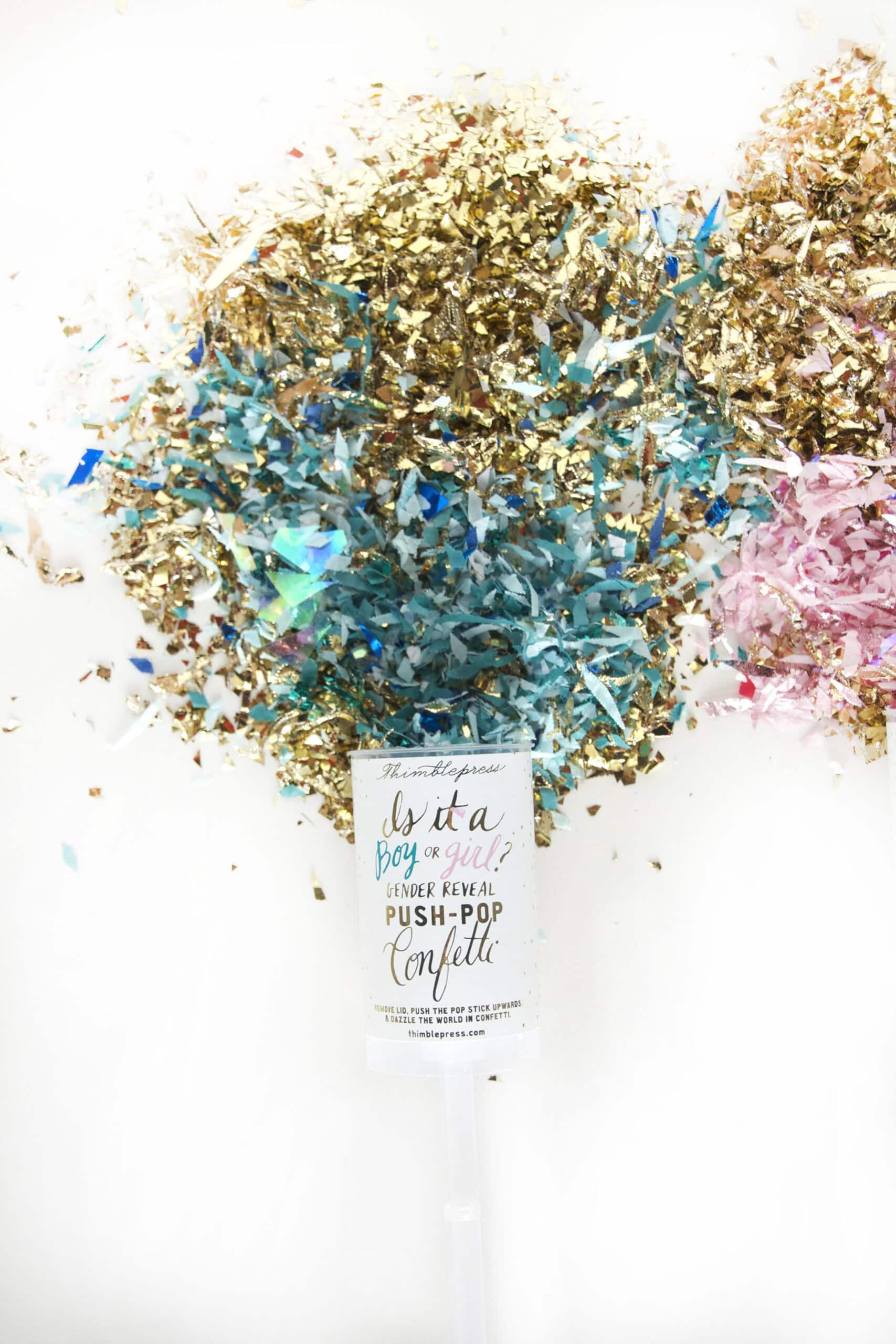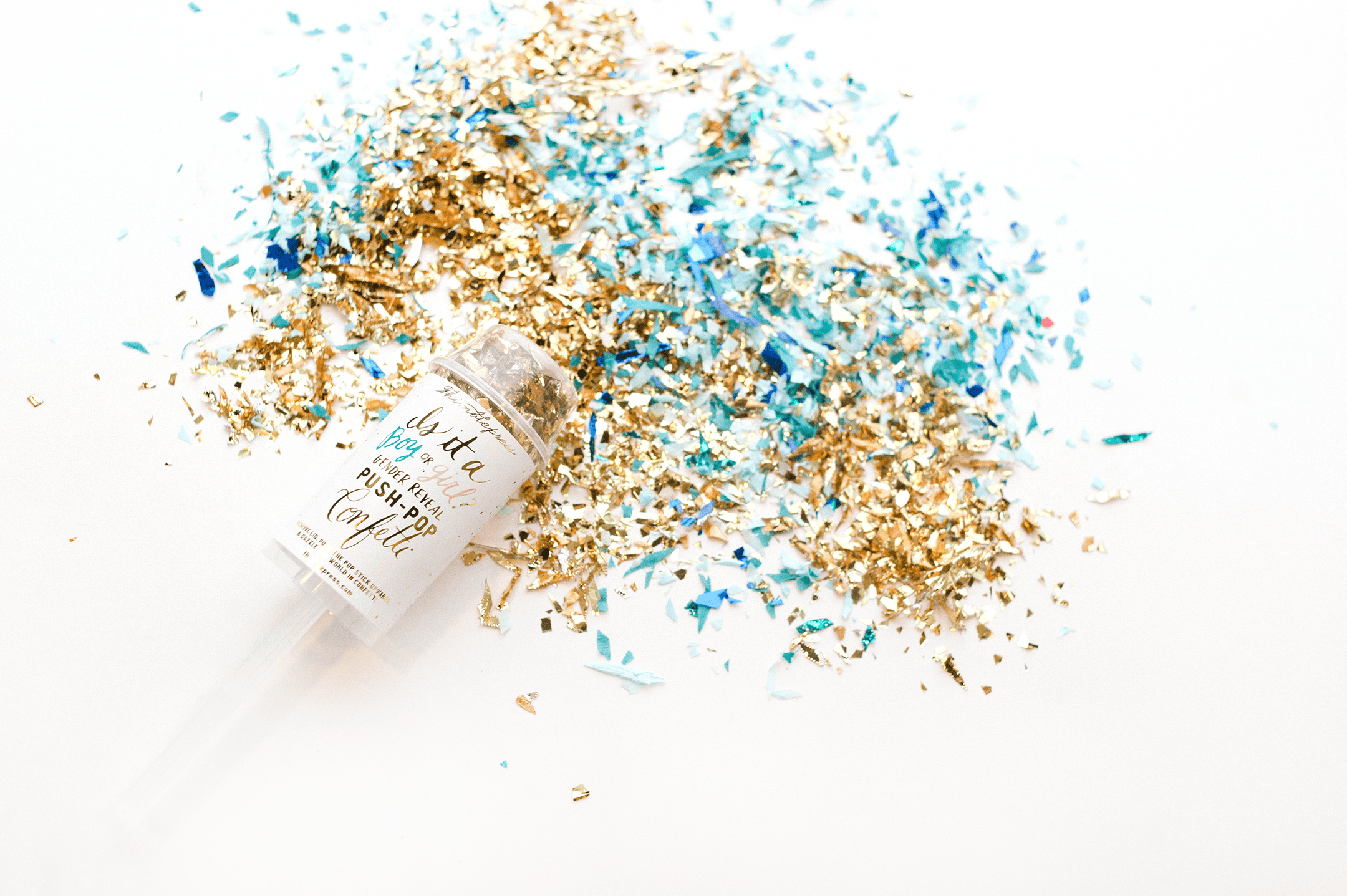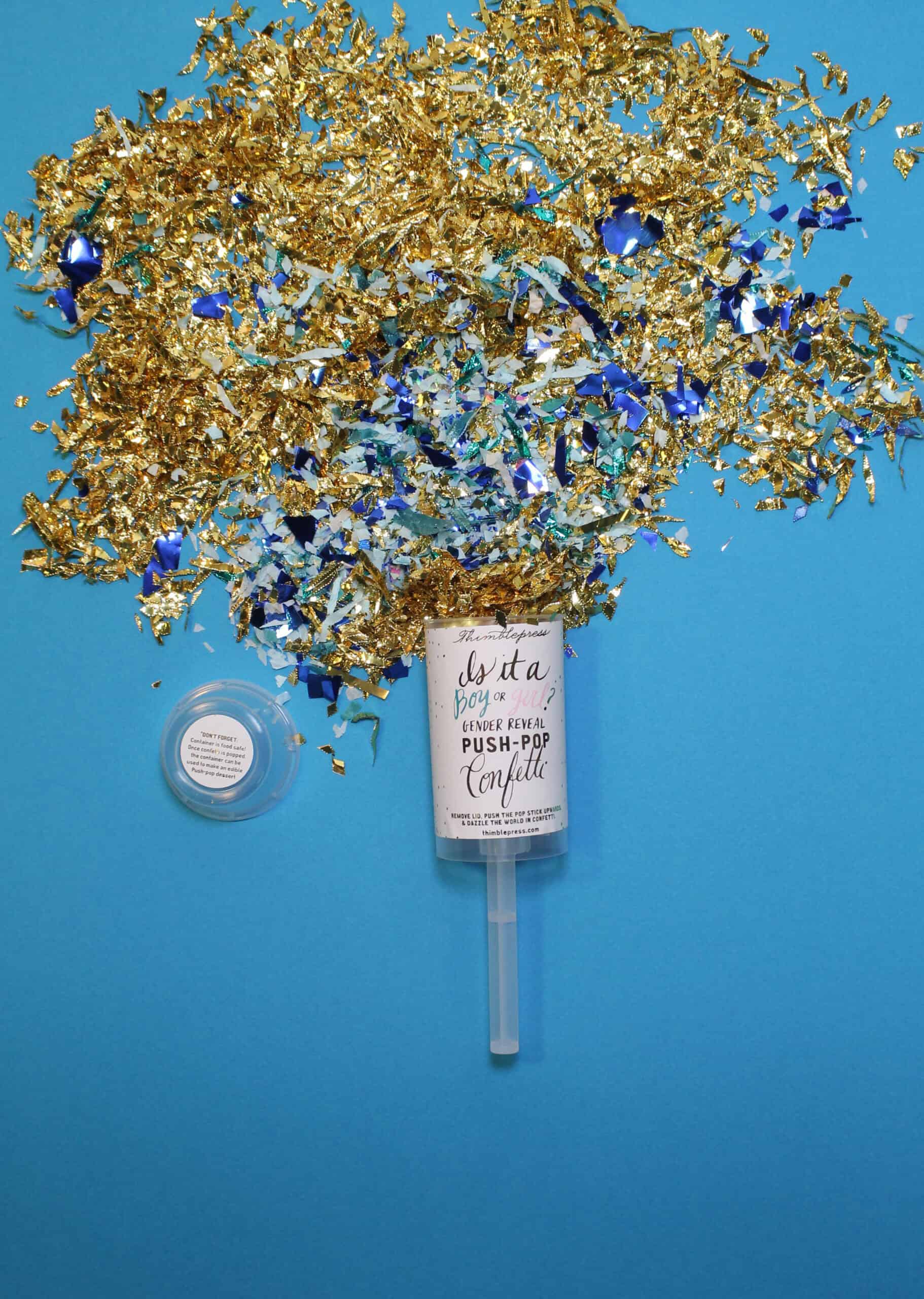 Announce the gender of a new arrival of a BOY with this BLUE gender reveal push-pop confetti™! Blue confetti is housed in the middle of the push-pop that is covered by the gold foil stamped label. Gold confetti are on both visible ends of the container to ensure the gender is not revealed until you decide! When ready to reveal the gender, remove the shrink band and the lid and push the pop stick upwards (serve it like a volleyball). As the confetti flies and lands, the gender will be revealed with the color that was once concealed! 1.5″ x 7.5″ (including handle). Reusable, food-safe container. Hand-created and packaged. A mix of hand-cut paper and metallic shapes. Packaging is gold foil stamped and art printed in the USA.