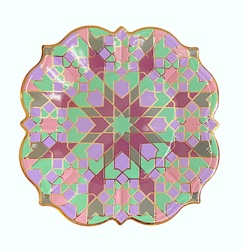 Combination of Andalucía colors with Moghul colors to bring a pastel and deep color combination palette. The geometric design lunch plates will give your party a fun vibe. Match these plates with our lilac, emerald or mint plates!