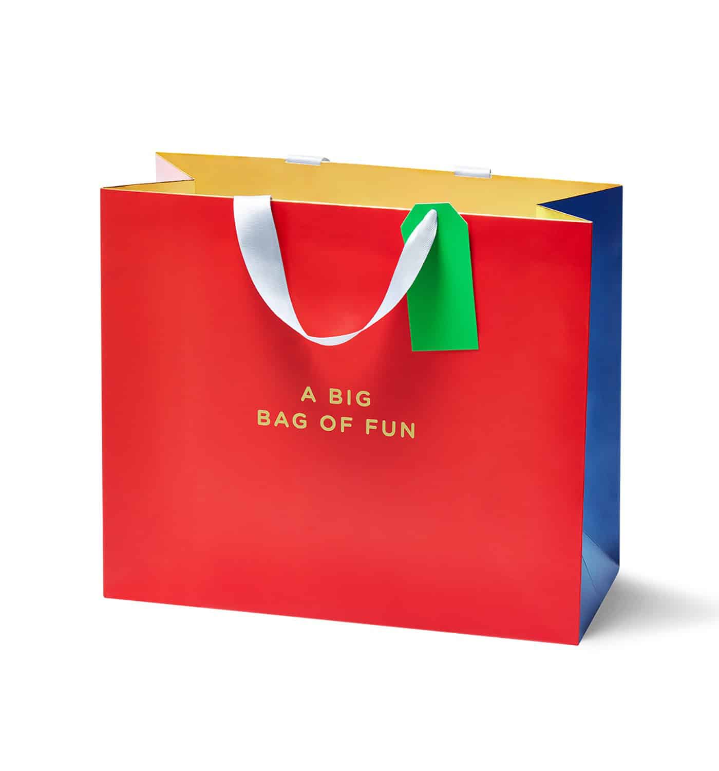 Red paper gift bag with white handles, green tag, and "A BIG BAG OF FUN" text.