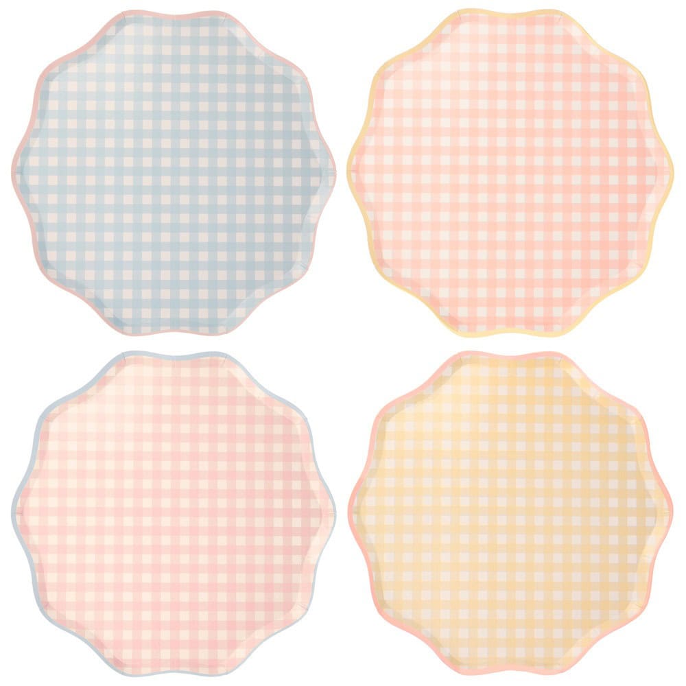 Gingham is a classic spring and summer print, and looks amazing on our party tableware. These dinner plates feature a delightful scalloped edge with a co-ordinating colored border. They are perfect for parties, picnics and baby showers.