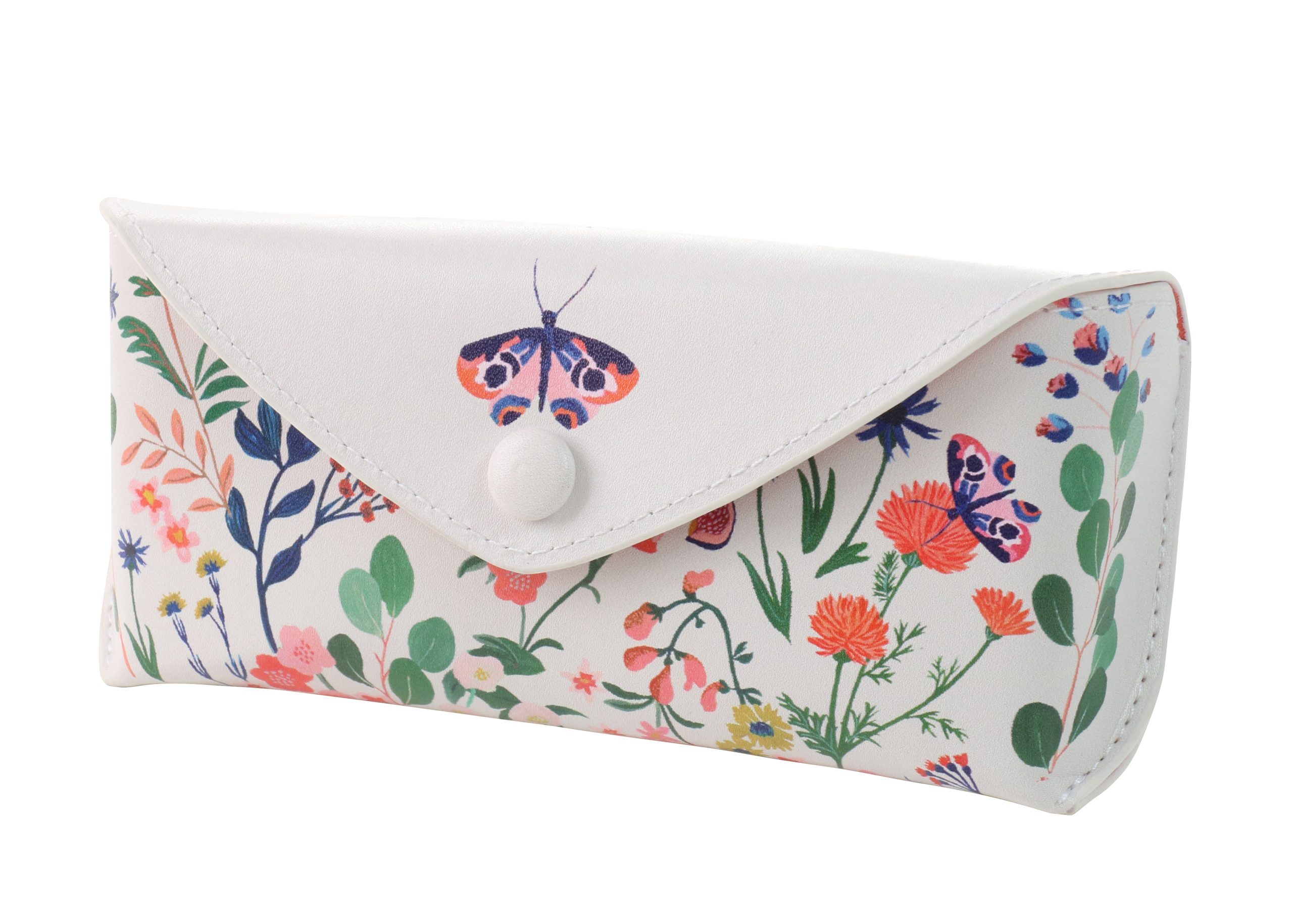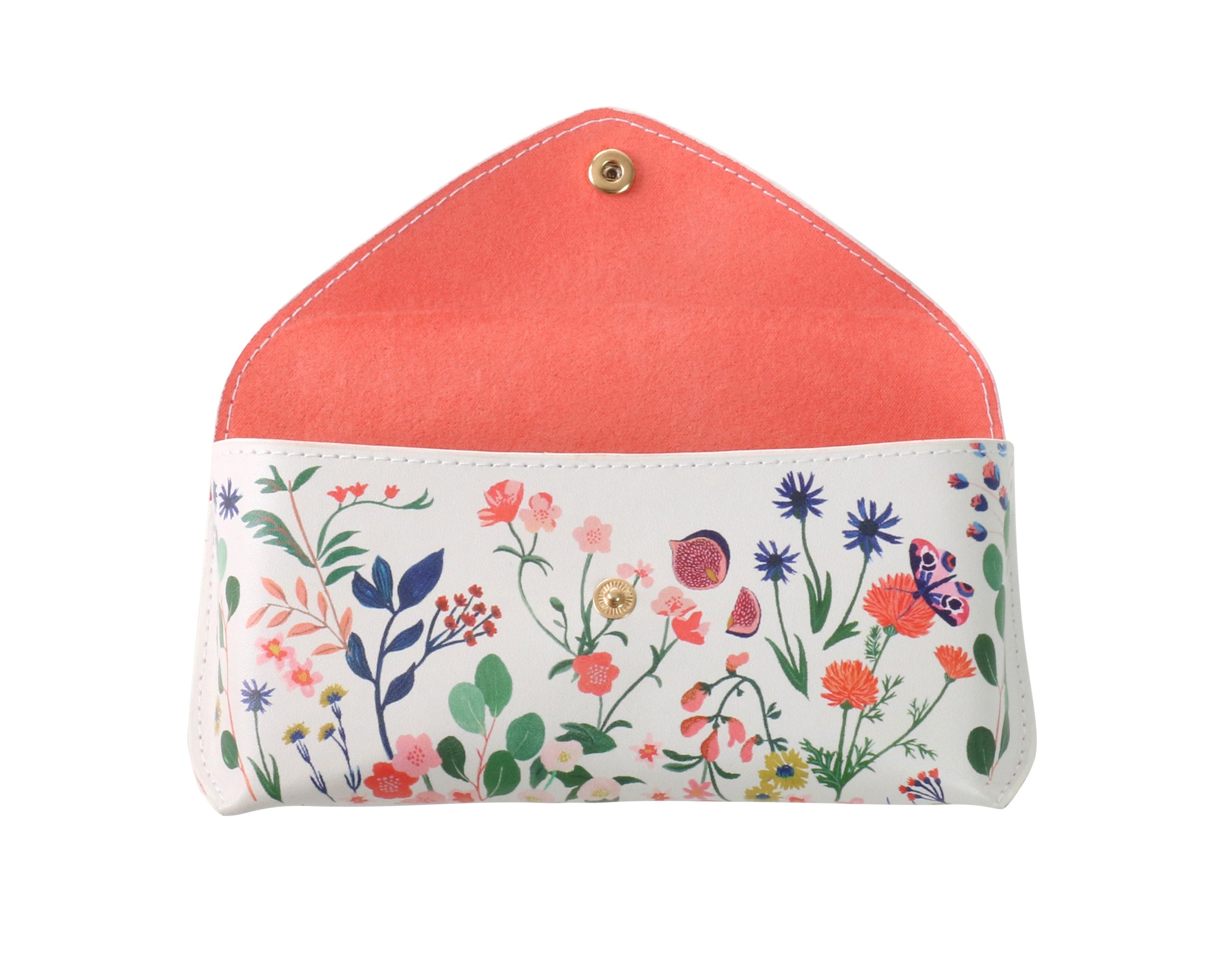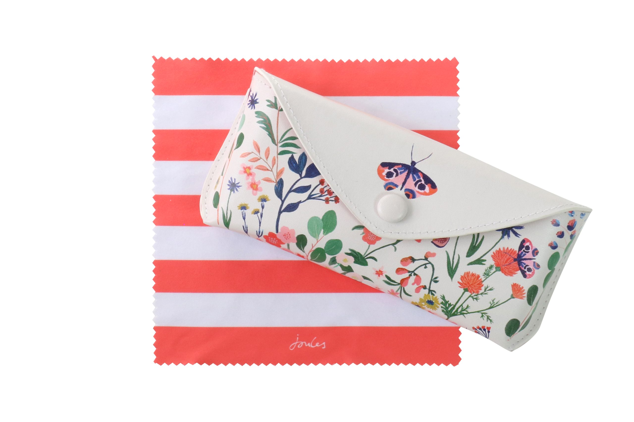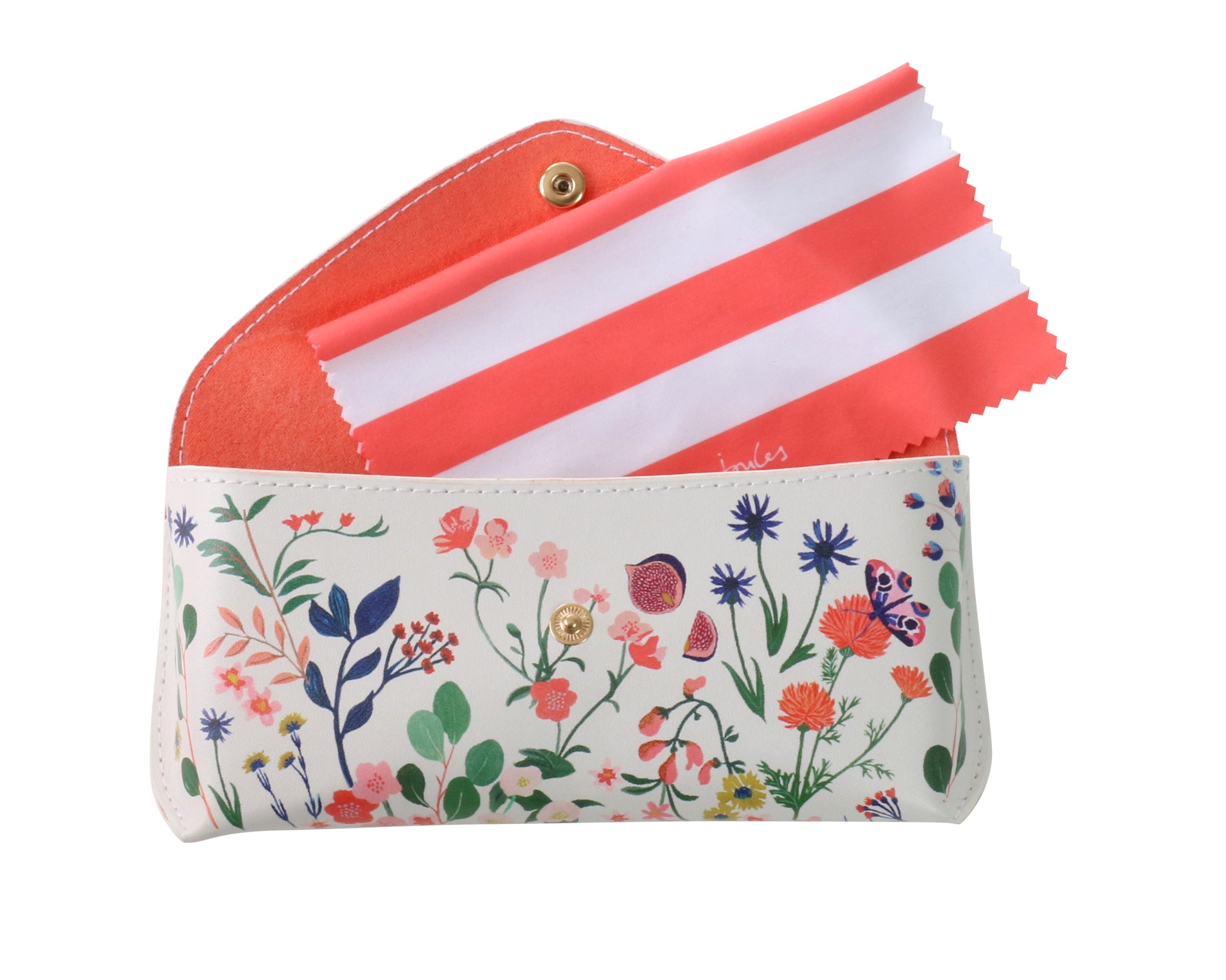 Keep your specs or sunglasses safe from scratches in this beautiful Joules floral print glasses case, with coral lining and a popper fastening. Includes a coral striped cleaning cloth. Outer: made from 20% recycled post-consumer polyester and 80% conventional polyurethane