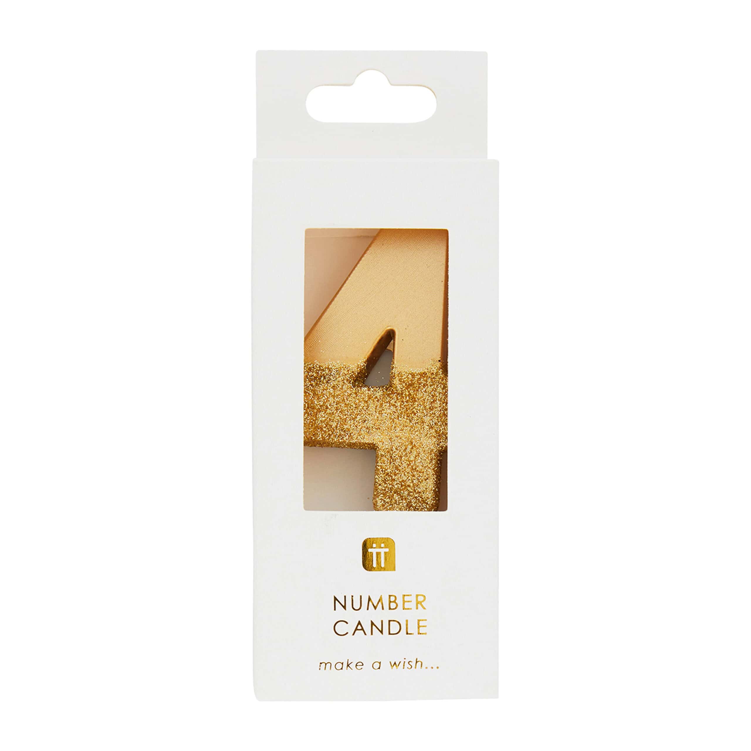 Gold number 4 birthday candle dipped with glitter