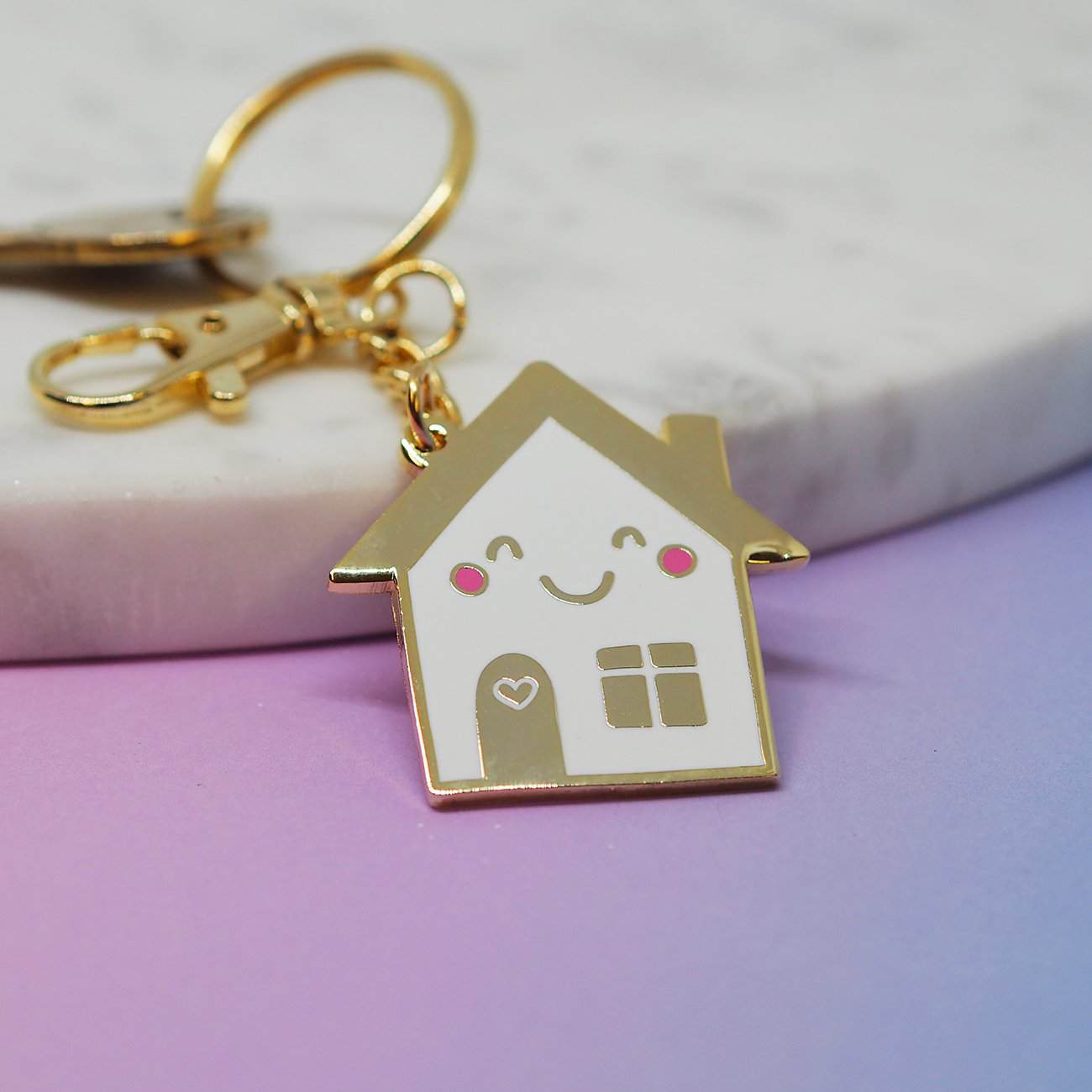 This luxury hard enamel gold keychain measures approx 45mm x 40mm. It has a 25mm gold keyring attachment with lobster clasp (ideal for adding on trolley coins!) and comes with a Nutmeg and Arlo gold tag.