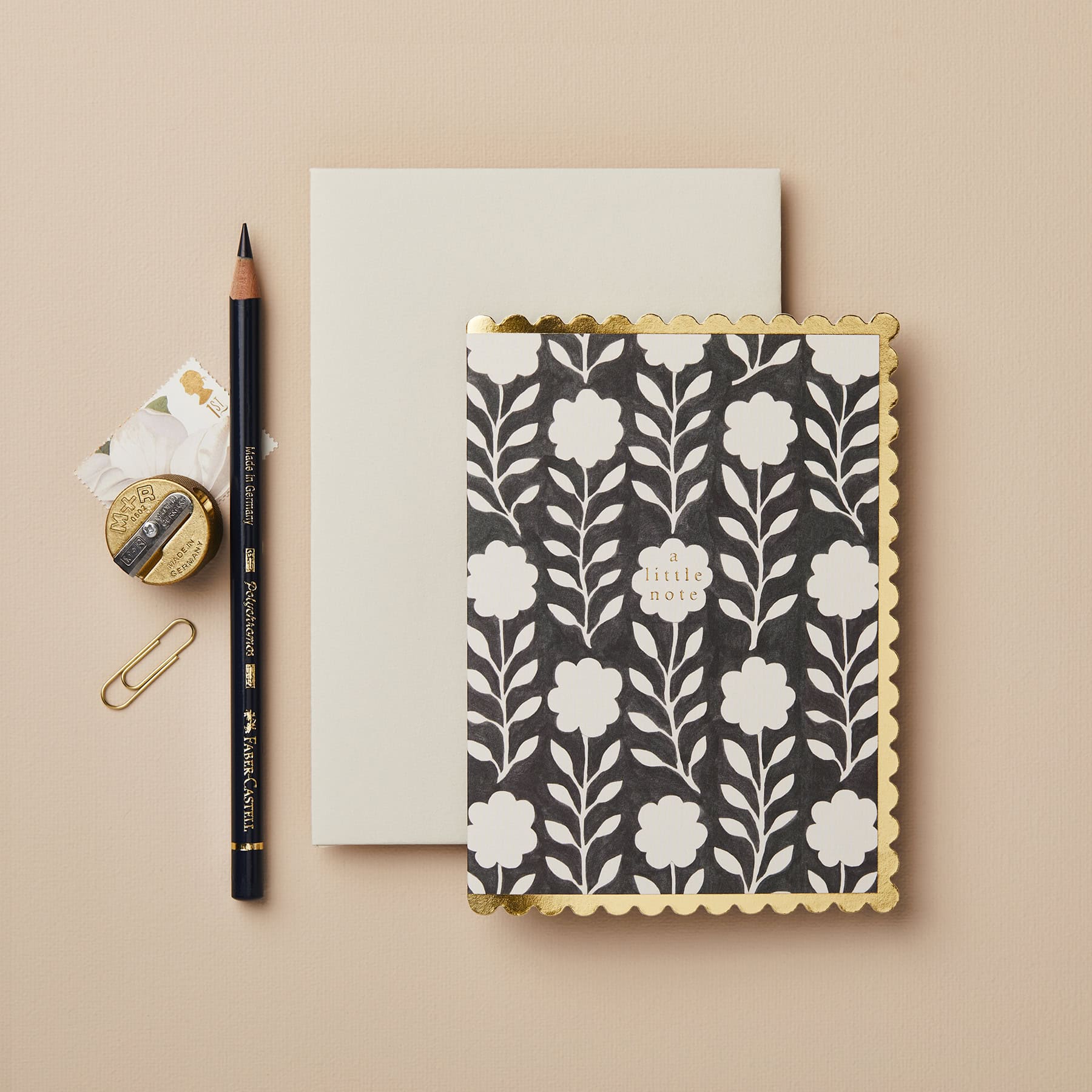 A deep black card featuring an all-over floral print and golden scallops. Suitable for a range of occasions, we’ve paired this design with a luxury pale grey envelope and a subtle gold message on the front reads ‘A Little Note’.