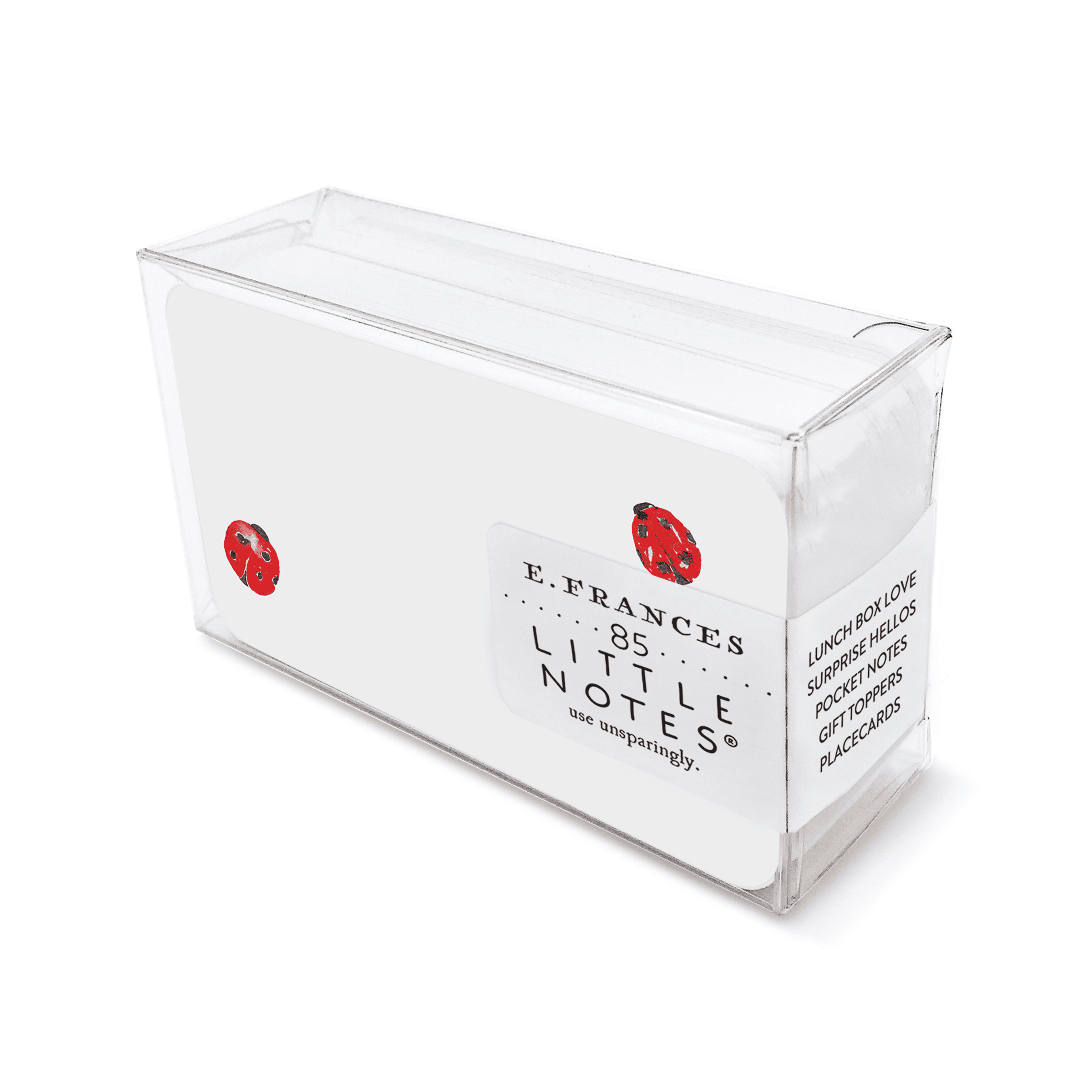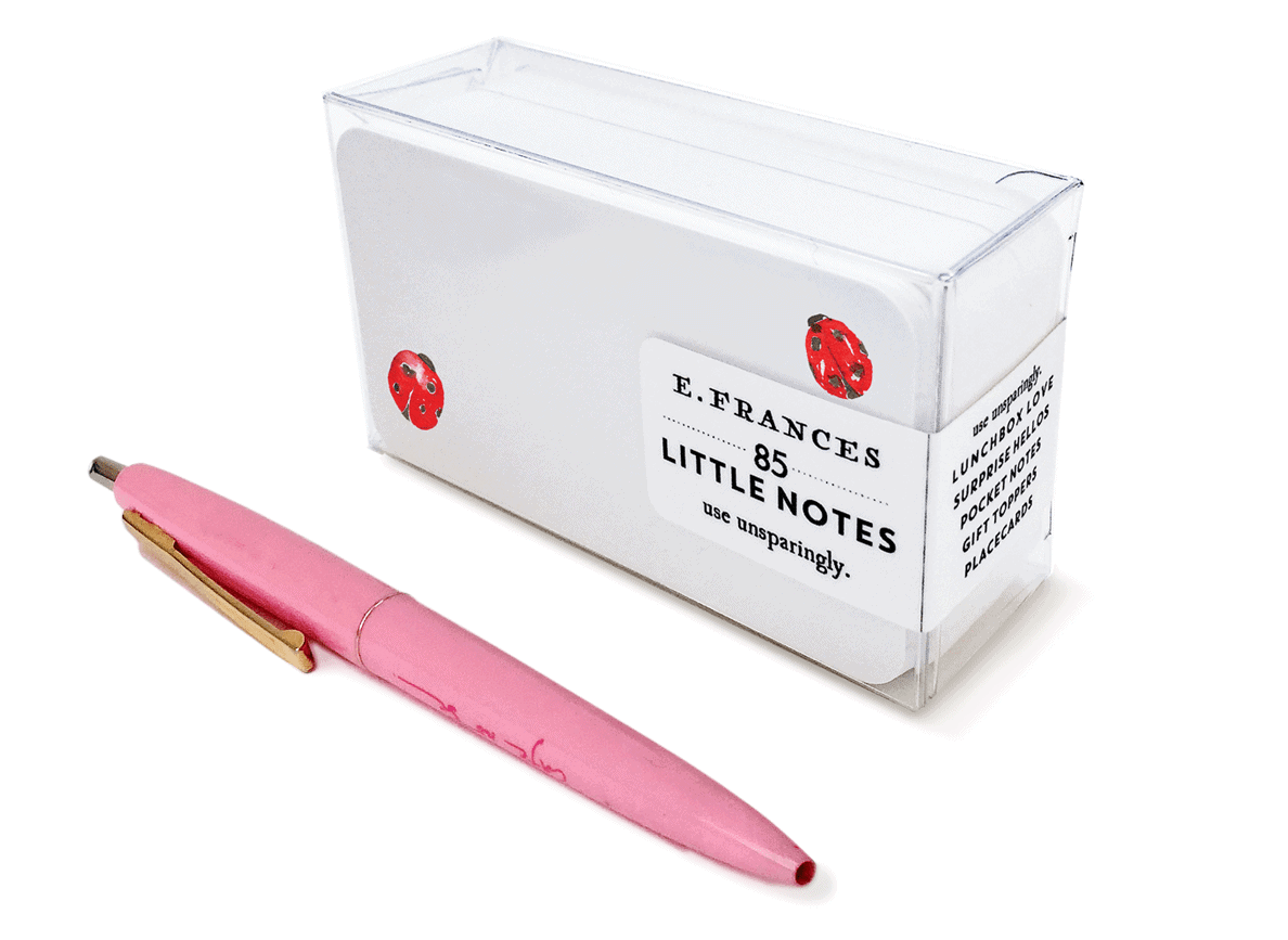 Eighty-five ladybug little note cards cozily boxed together for you to use unsparingly as place cards, surprise notes, lunchbox notes. Reverse has a complementary design.