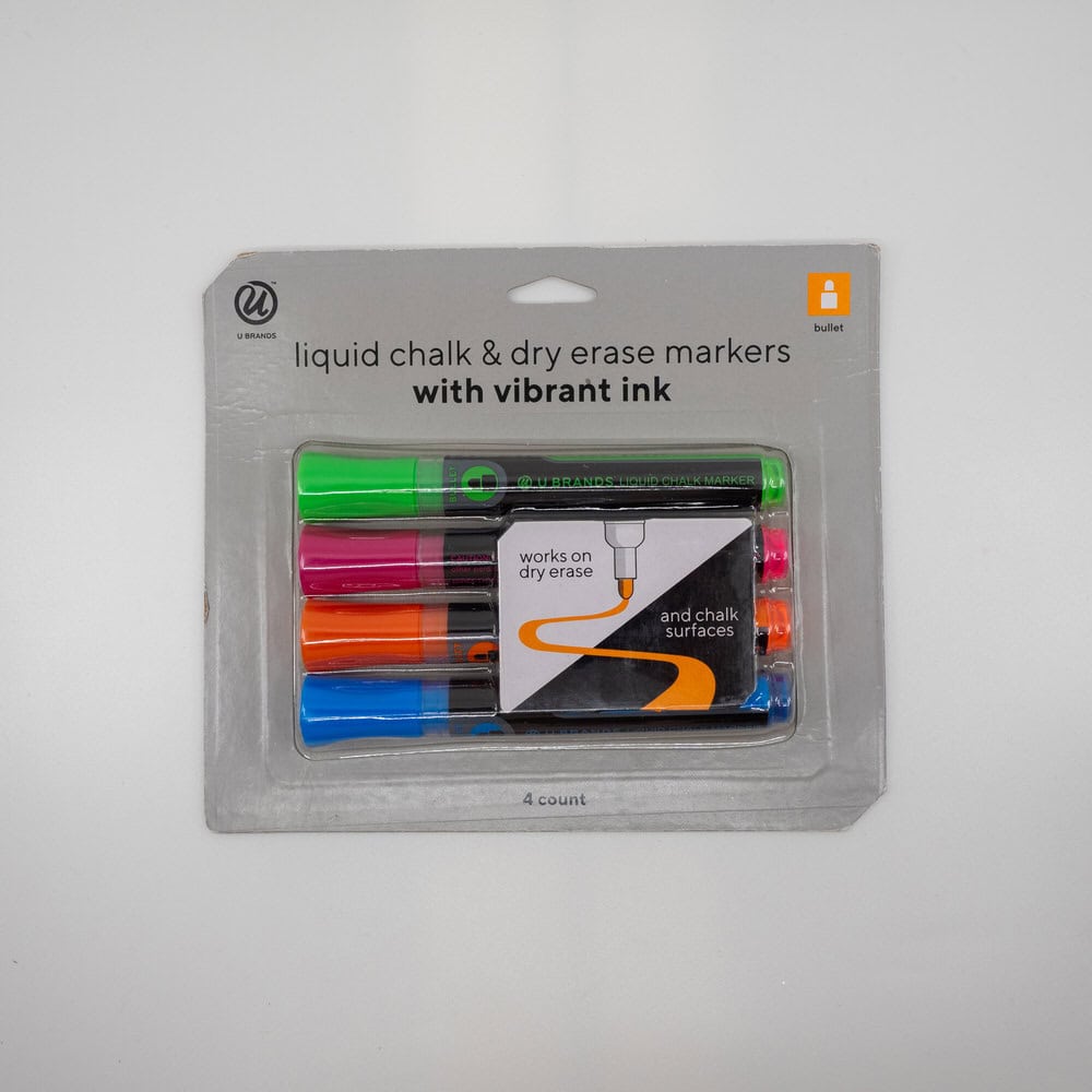 U Brands Liquid Chalk and Dry Erase Markers are bullet tipped in assorted bright colors. Liquid chalk and dry erase markers are a perfect and practical writing tool for any chalkboard or glass board surface. Ink formula allows for dual surface and purpose writing on both dry erase and chalkboard surfaces for one marker that does it all. These markers have taken the mess, dust and frustration out of writing with chalk.