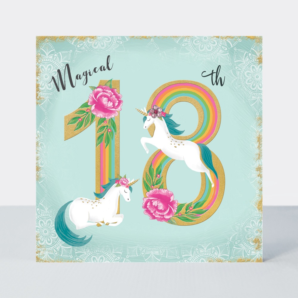 A beautiful, luxurious 18th birthday card. This milestone card in a pretty unicorn design is finished with lashings of detailed gold foil and a pretty gem-encrusted flower attachment. Supplied with a pink envelope.