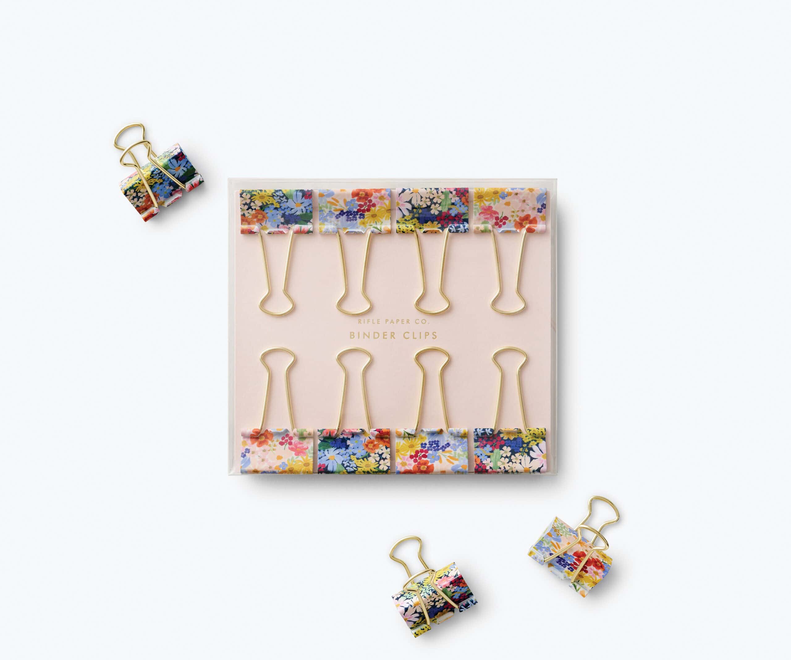 Add a pop of color and pattern to your desk with our Margaux binder clips. Each assorted set of eight clips includes two different designs with gold handles. 2.5″ L. Metal printed in full color.