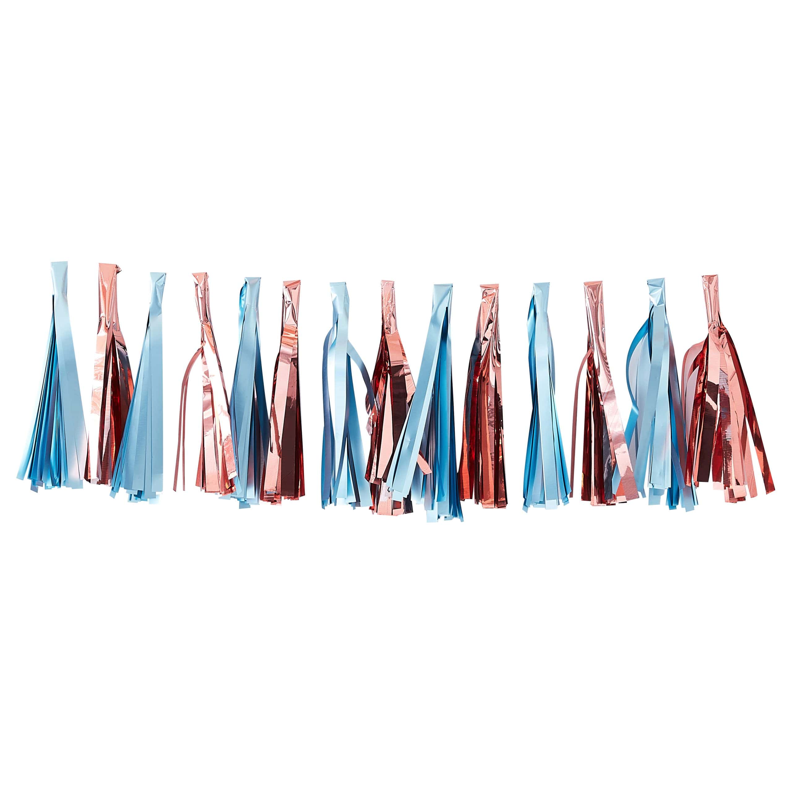 Our tassel garland is a great way to stylishly dress a baby shower party. The blue & rose gold tassels shine brightly around the room.