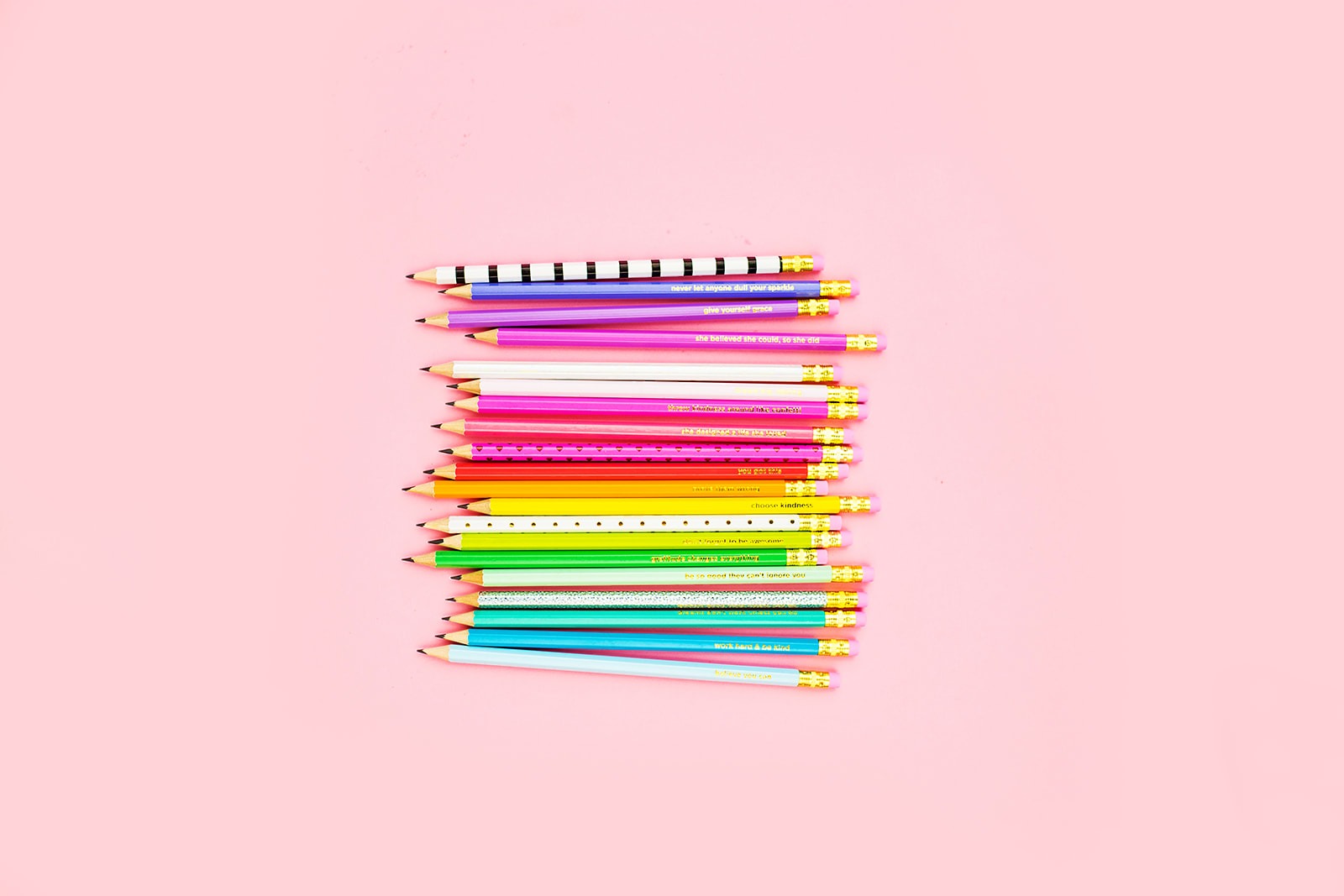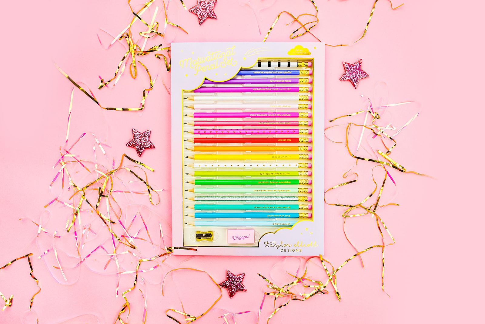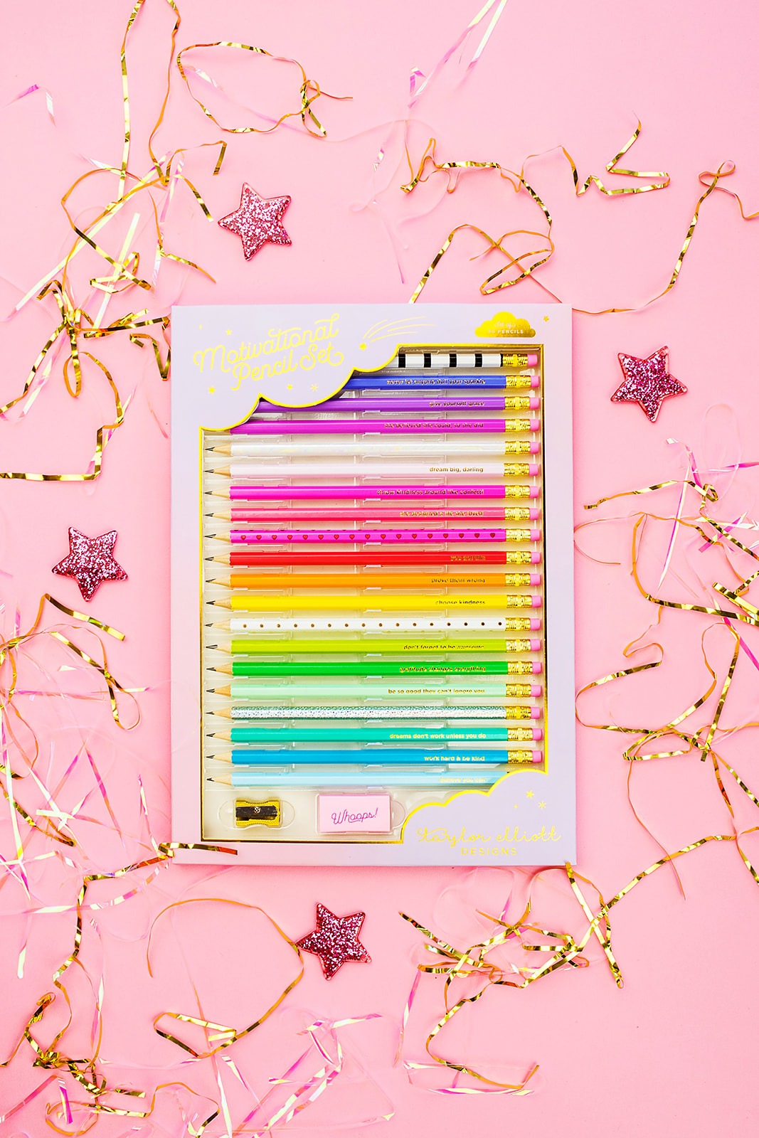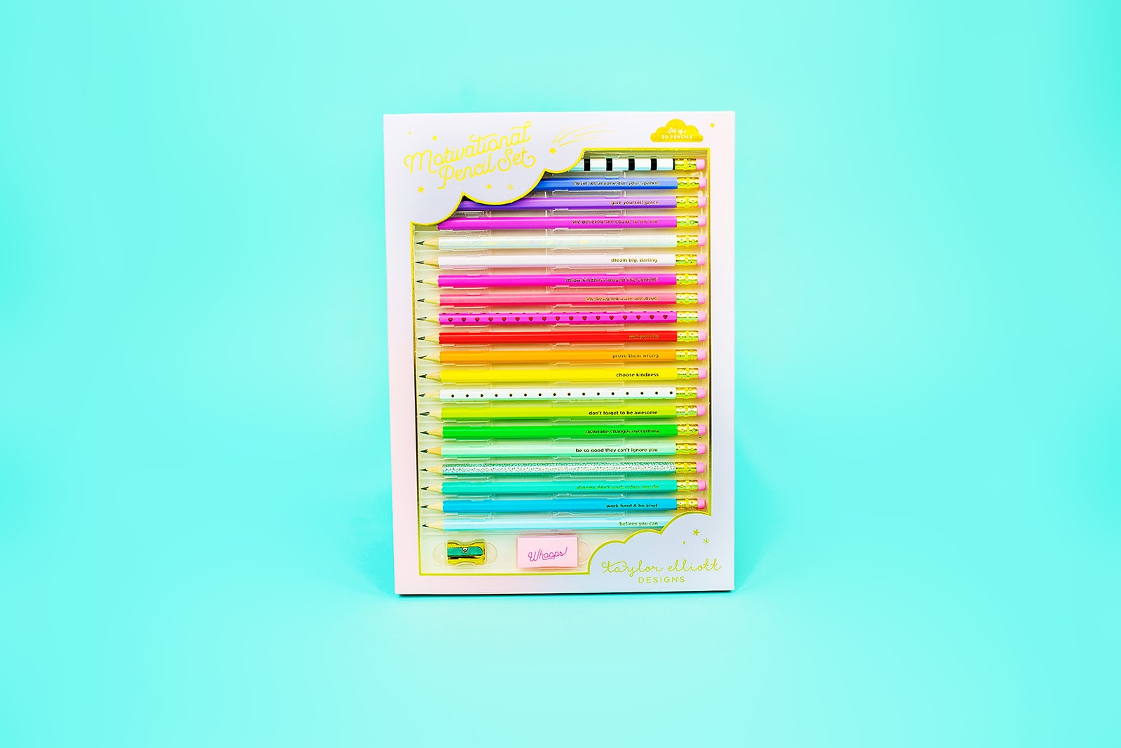 Pencil sayings: Never let anyone dull your sparkle; give yourself grace; she believed she could, so she did; throw kindness around like confetti; dream big, darling; she designed a life she loved; you got this; prove them wrong; choose kindness; don’t forget to be awesome; gratitude changes everything; be so good they can’t ignore you; dreams don’t work unless you do; believe you can; work hard & be kind. Pencils also include 5 pattern only pencils: black and white stripes; iridescent; red foil hearts; gold foil polka dots; silver hologram sparkles