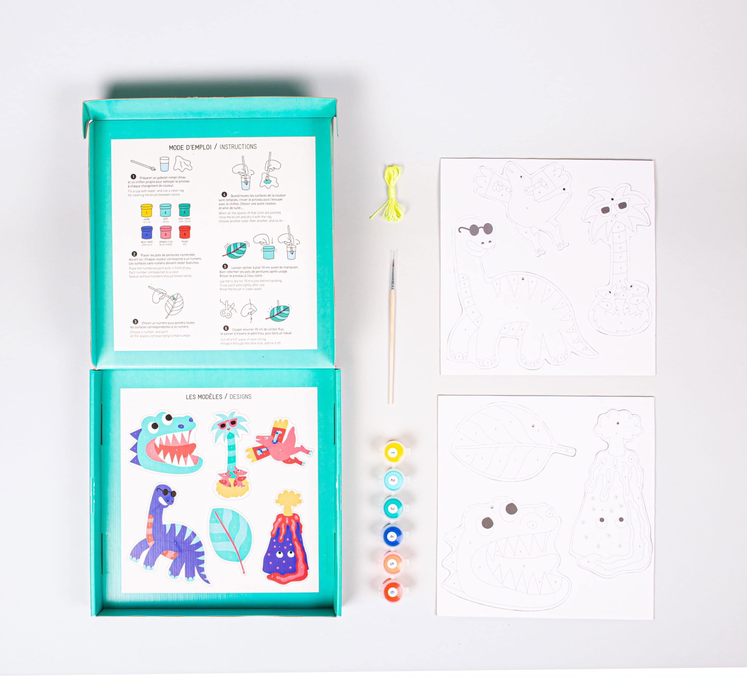string Follow the numbers on illustration to paint with the right colors. Once your artwork is completed, hang your small decorative pendant or gift it. Content: 6 hanging designs, 1 brush, and 6 small pots of acrylic paint and 1 cord to hang. Format: 2 cardboards of 9.4 x 9.4in. Composition: 100% paper & acrylic paint. Designed in Paris.