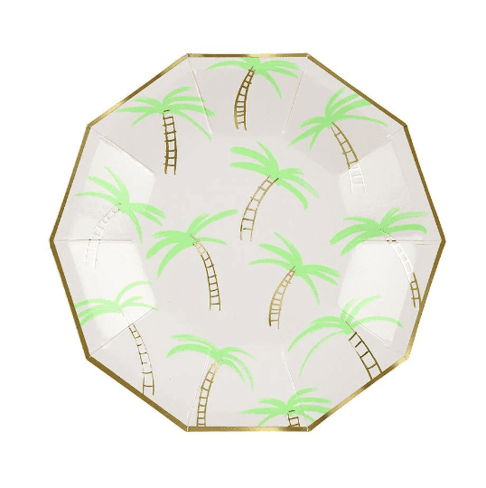 These stylish plates are decorated with a beautifully illustrated palm tree pattern with neon green leave and gold foil trunks.