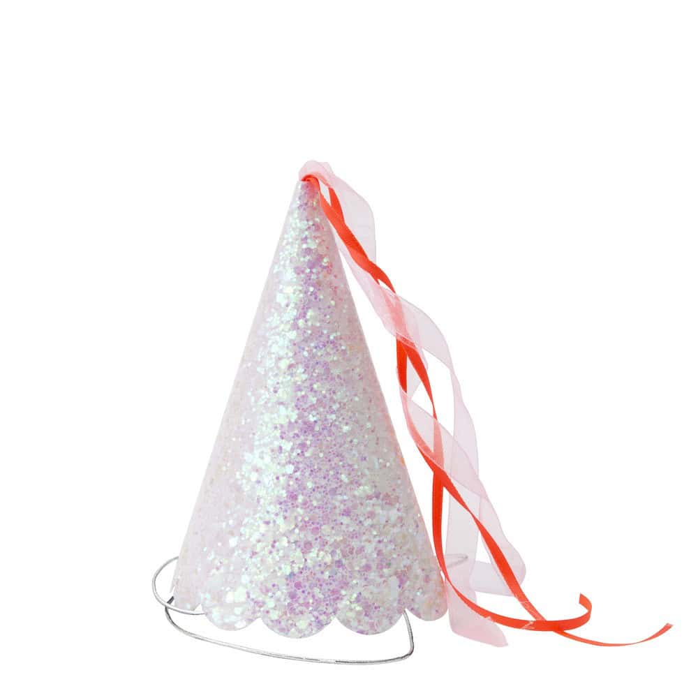 Party hats beautifully crafted with a scallop edge, glitter and gorgeous ribbons. Perfect for a magical princess party. Feature stunning ribbon tassels Iridescent glitter detail for style and shine. Silver elastic. Scallop edge for a sensational effect. Pack of 8
