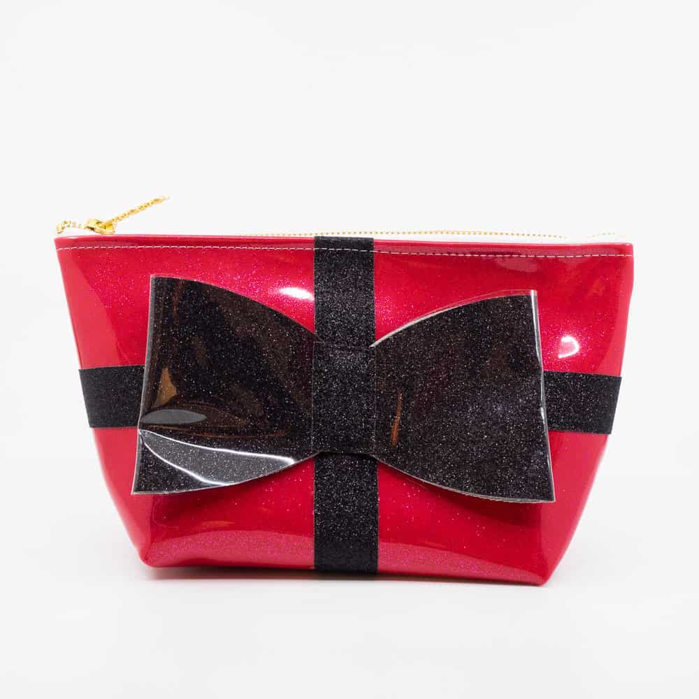 Glitter infused vinyl clutch with a glitter canvas bow applique This pouch has a three dimensional glitter vinyl bow topped in clear vinyl to protect from any wear and tear