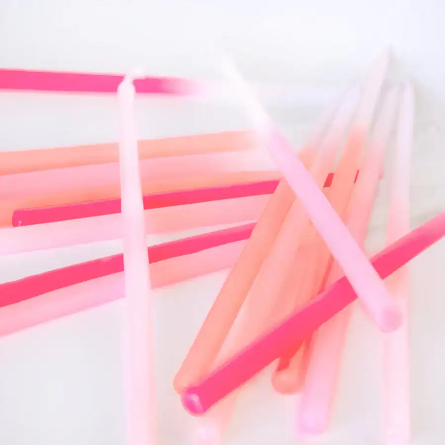 Pink and orange birthday candles in clear packaging, ideal for decorating cakes and celebrations.