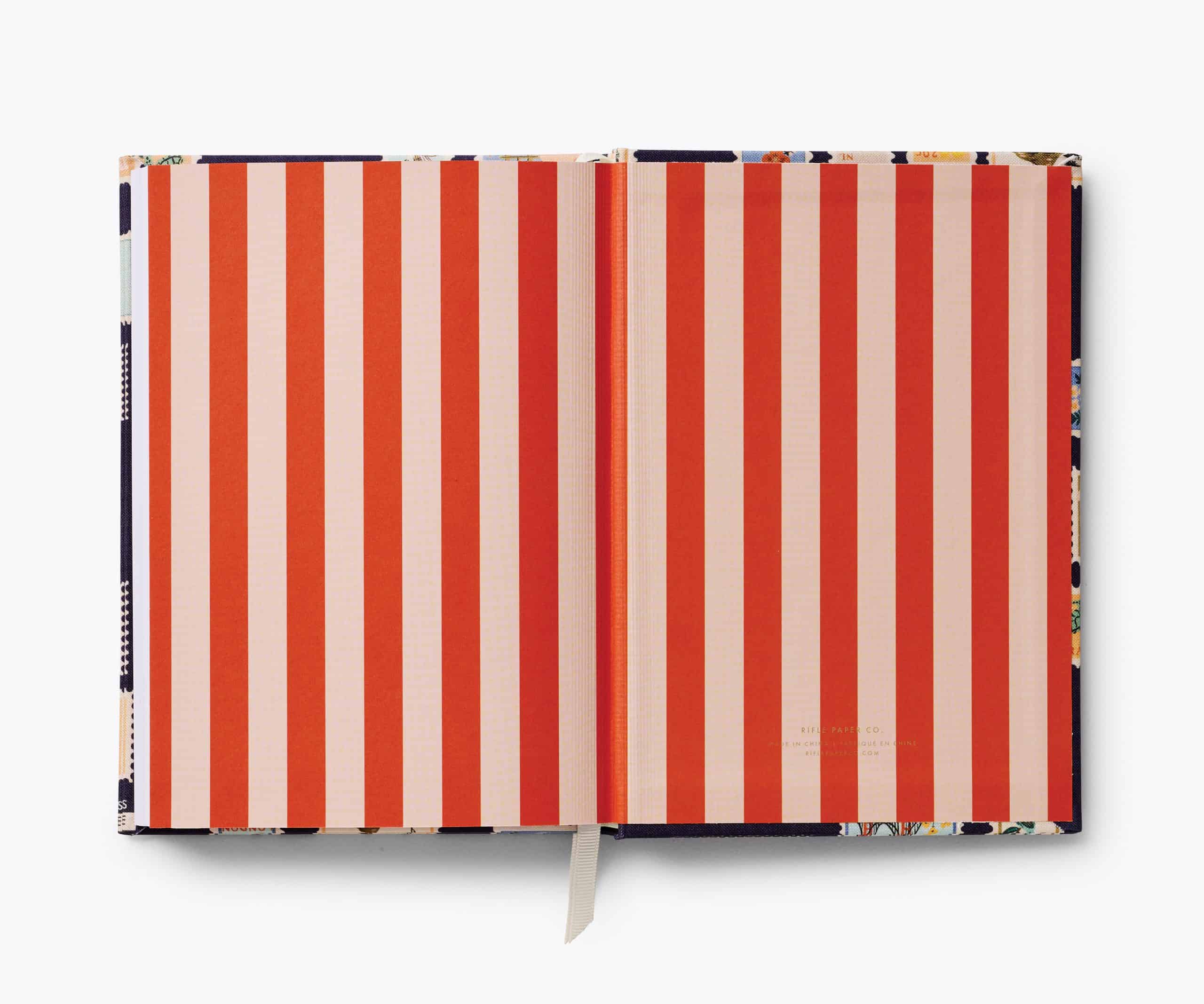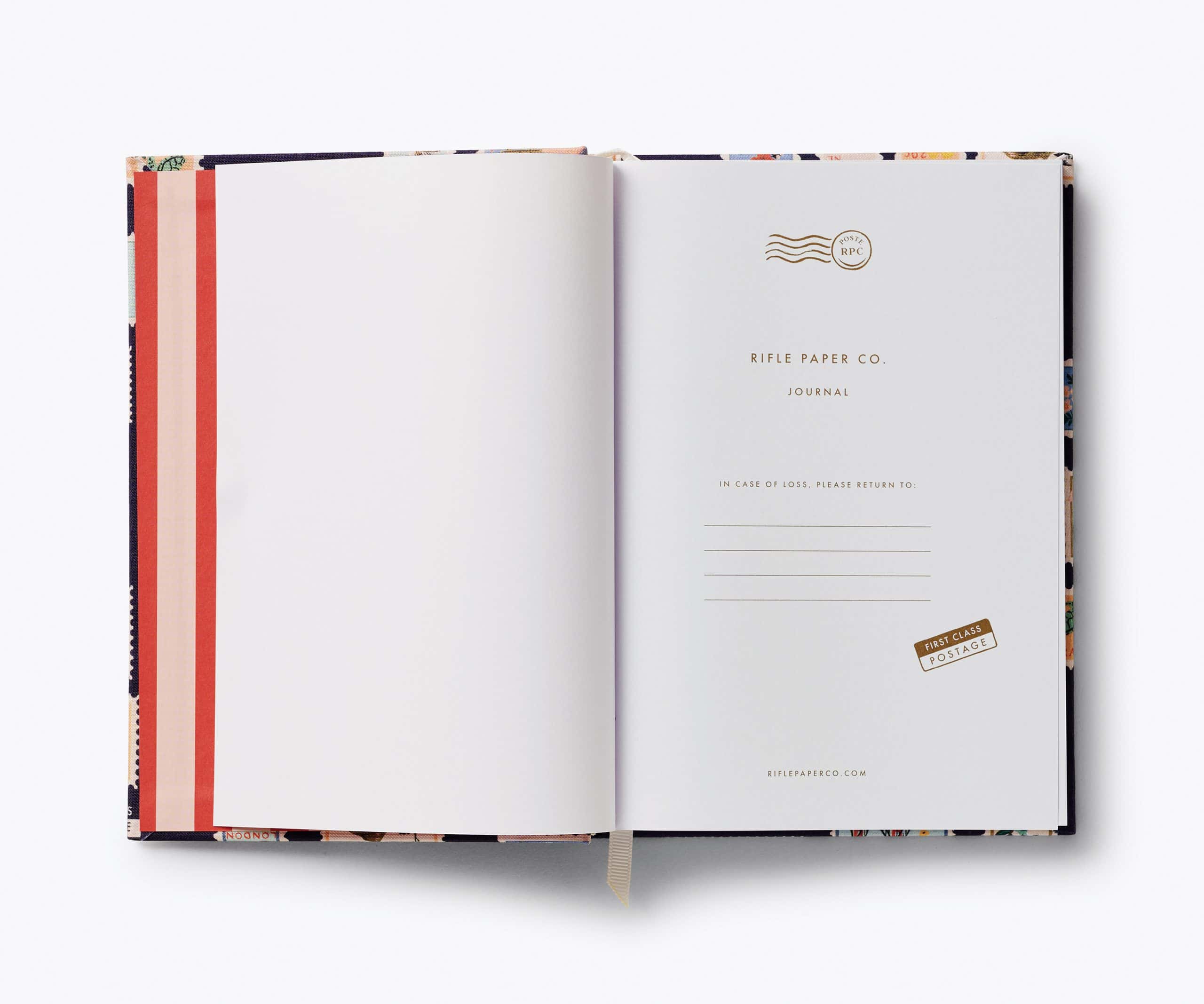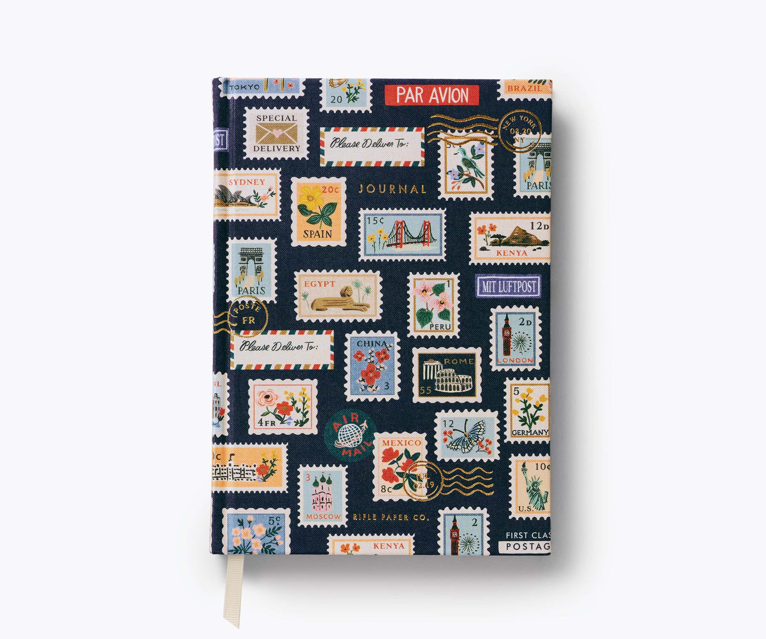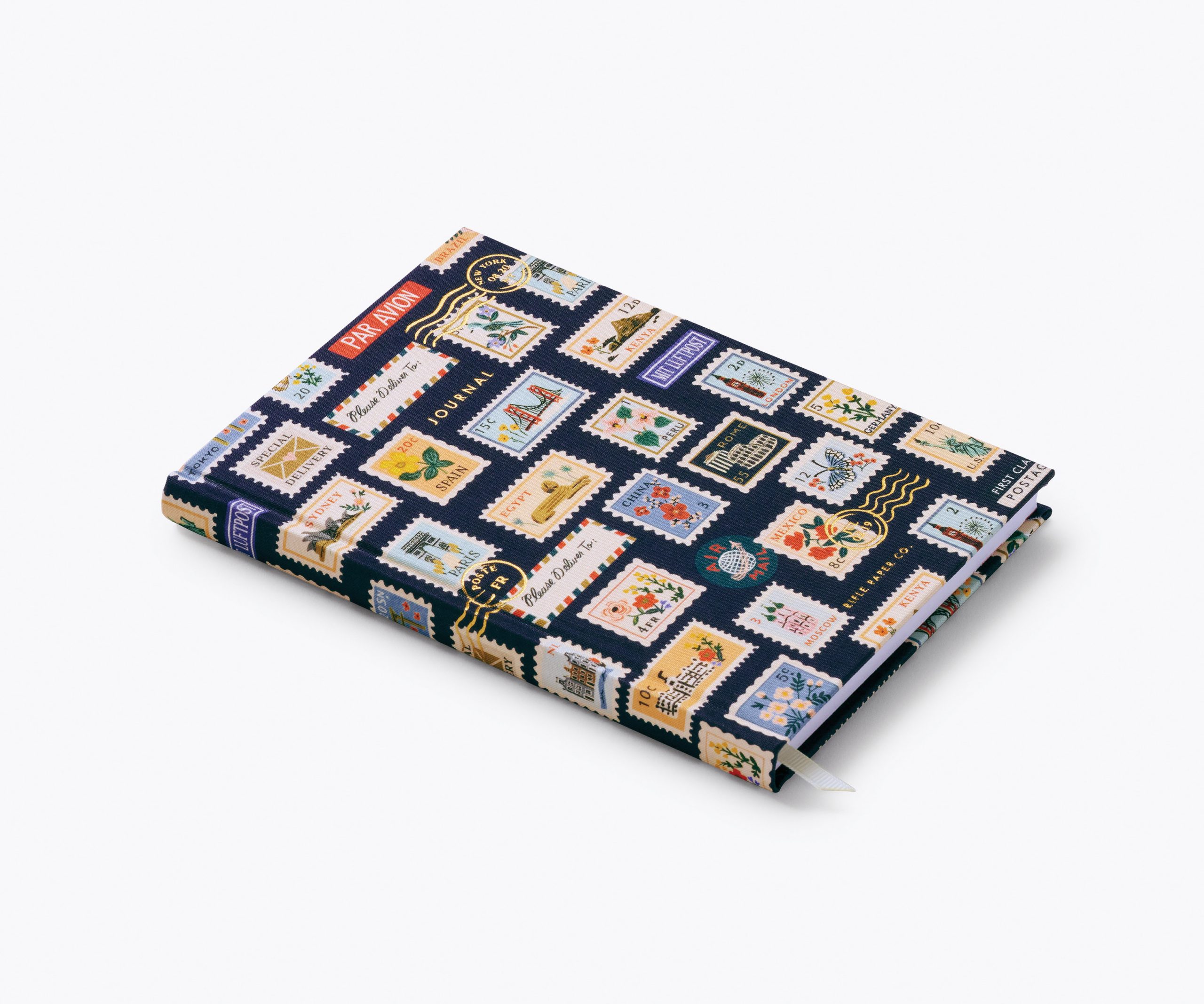 Let our Postage Stamps Fabric Journal inspire your next adventure with each turn of the page. It features a hard cover with printed book cloth, lay-flat binding, a coordinating bookmark, and gold foil accents.