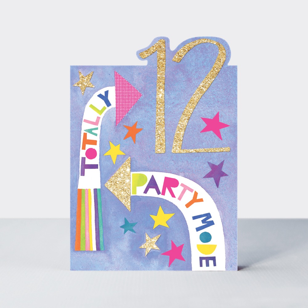This vibrant and bold graphic card is perfect for a 12th birthday. Printed with neon inks and finished with gold glitter, this card features a die-cut top and collaged wording appealing to this age group. Designed, printed and finished in UK on FSC paper