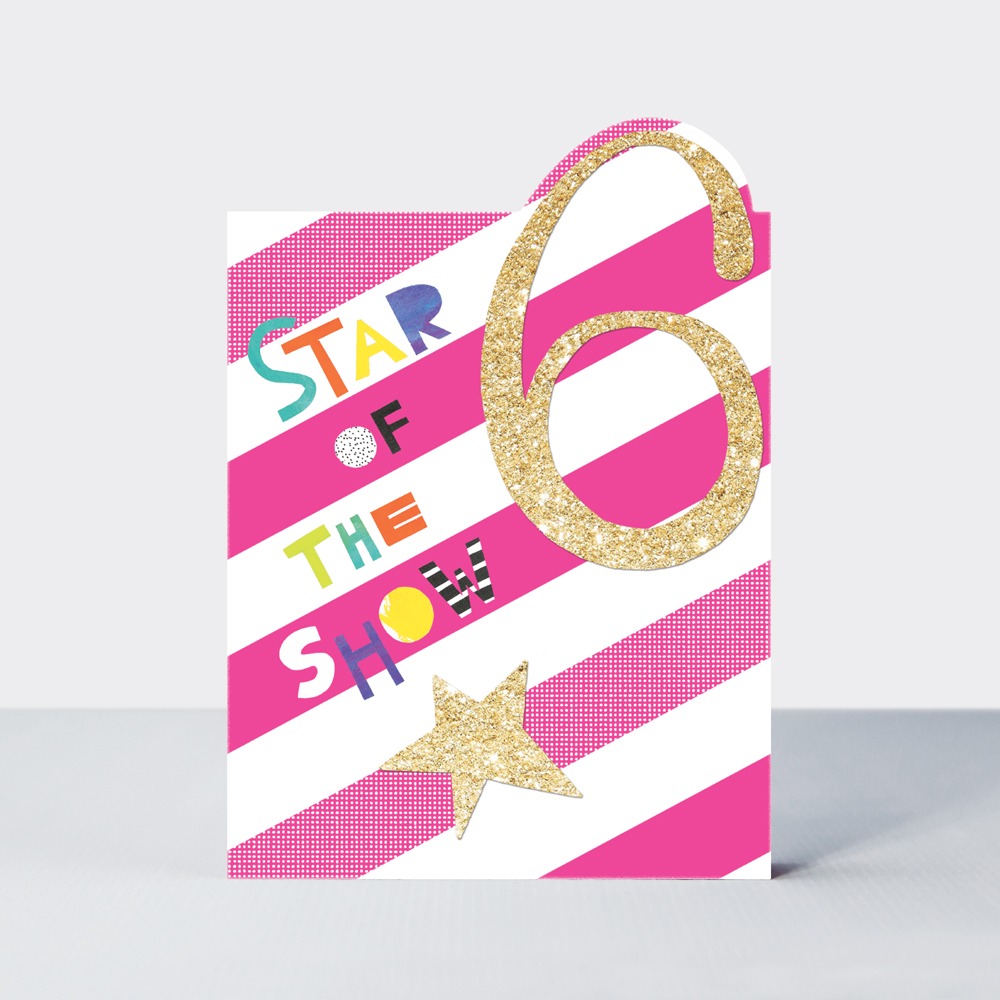 This vibrant and bold graphic card is perfect for an age 6 birthday. Printed with neon inks and finished with gold glitter, this card features a die-cut top and collaged wording appealing to this age group. Designed, printed and finished in UK on FSC paper