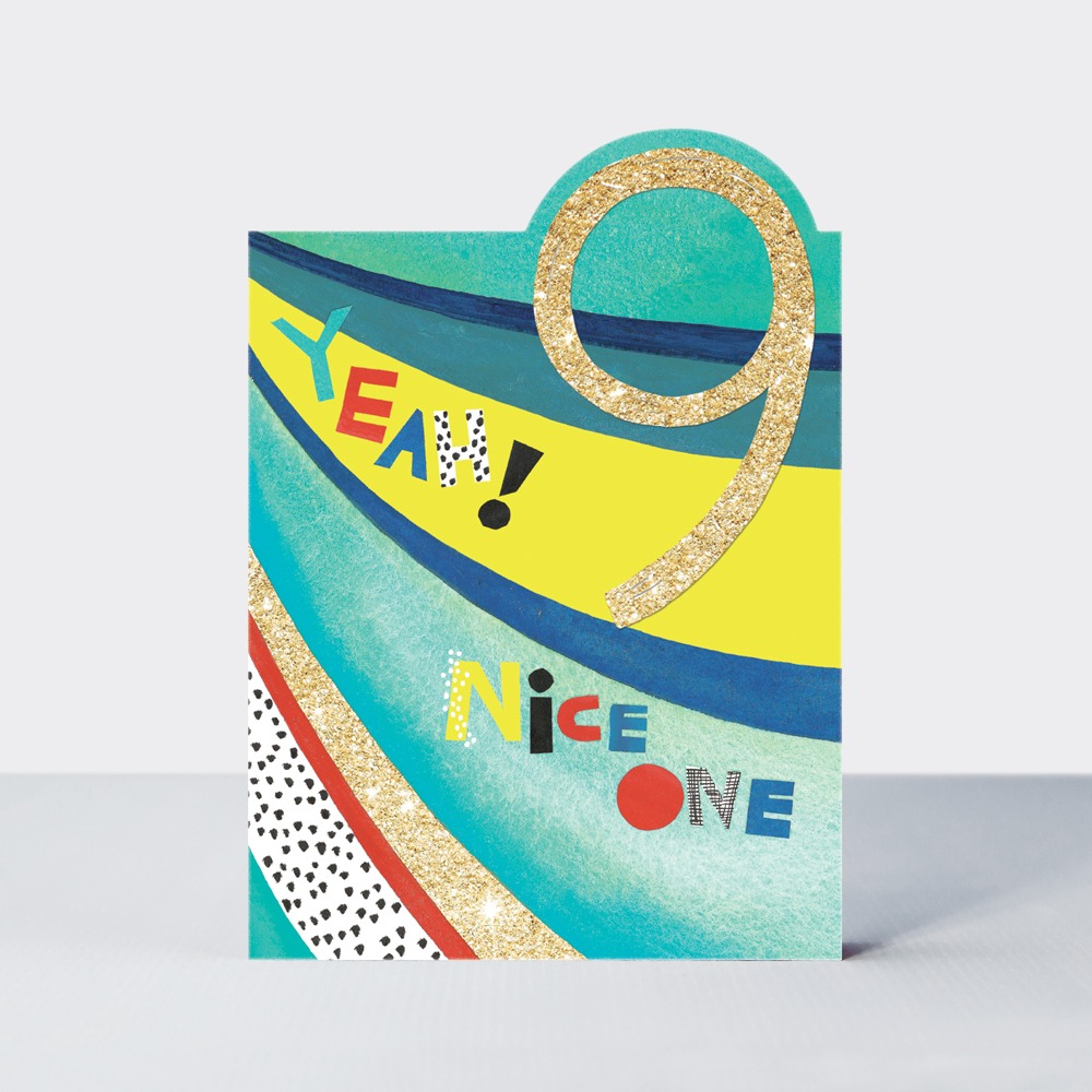 This vibrant and bold graphic card is perfect for an age 9 birthday. Printed with neon inks and finished with gold glitter, this card features a die-cut top and collaged wording appealing to this age group. Designed, printed and finished in UK on FSC paper