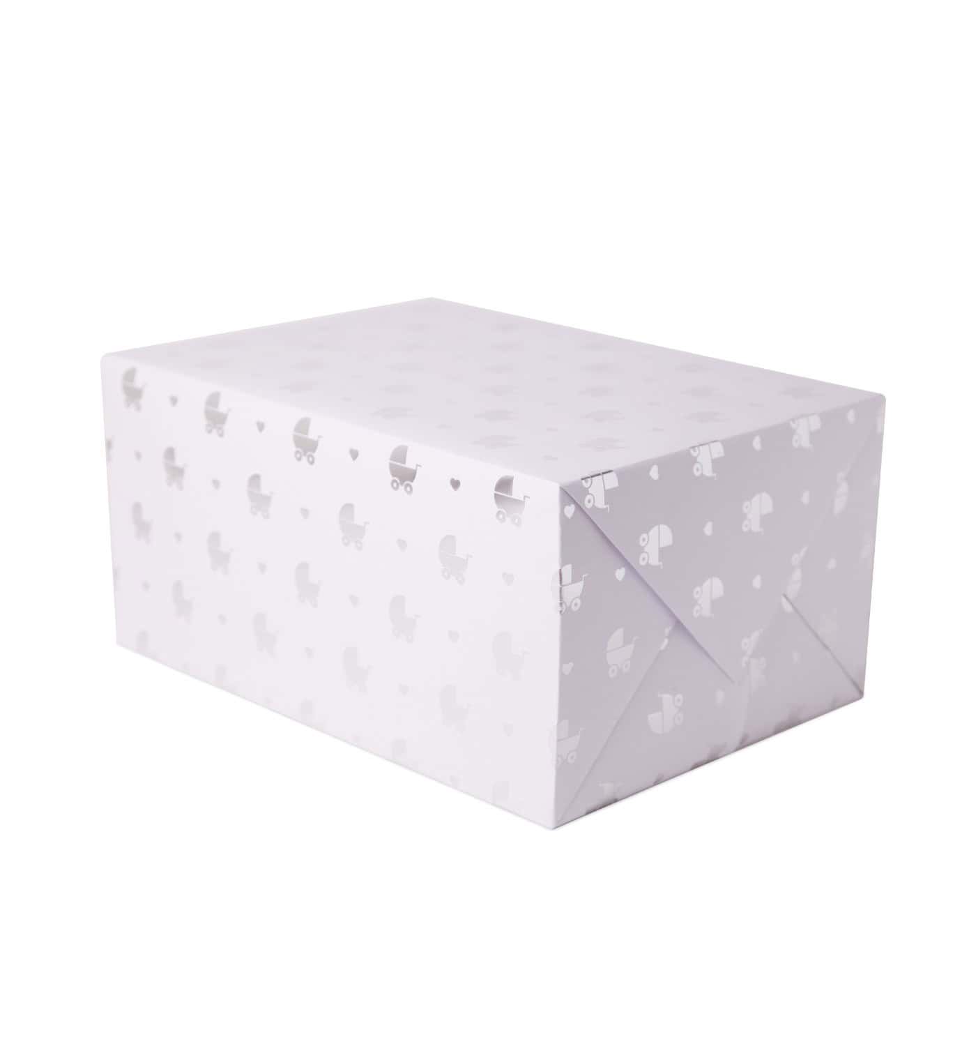 Delightful luxury wrapping paper featuring silver foiled pram design against white background. Perfect for baby gifts! 50 x70 cm