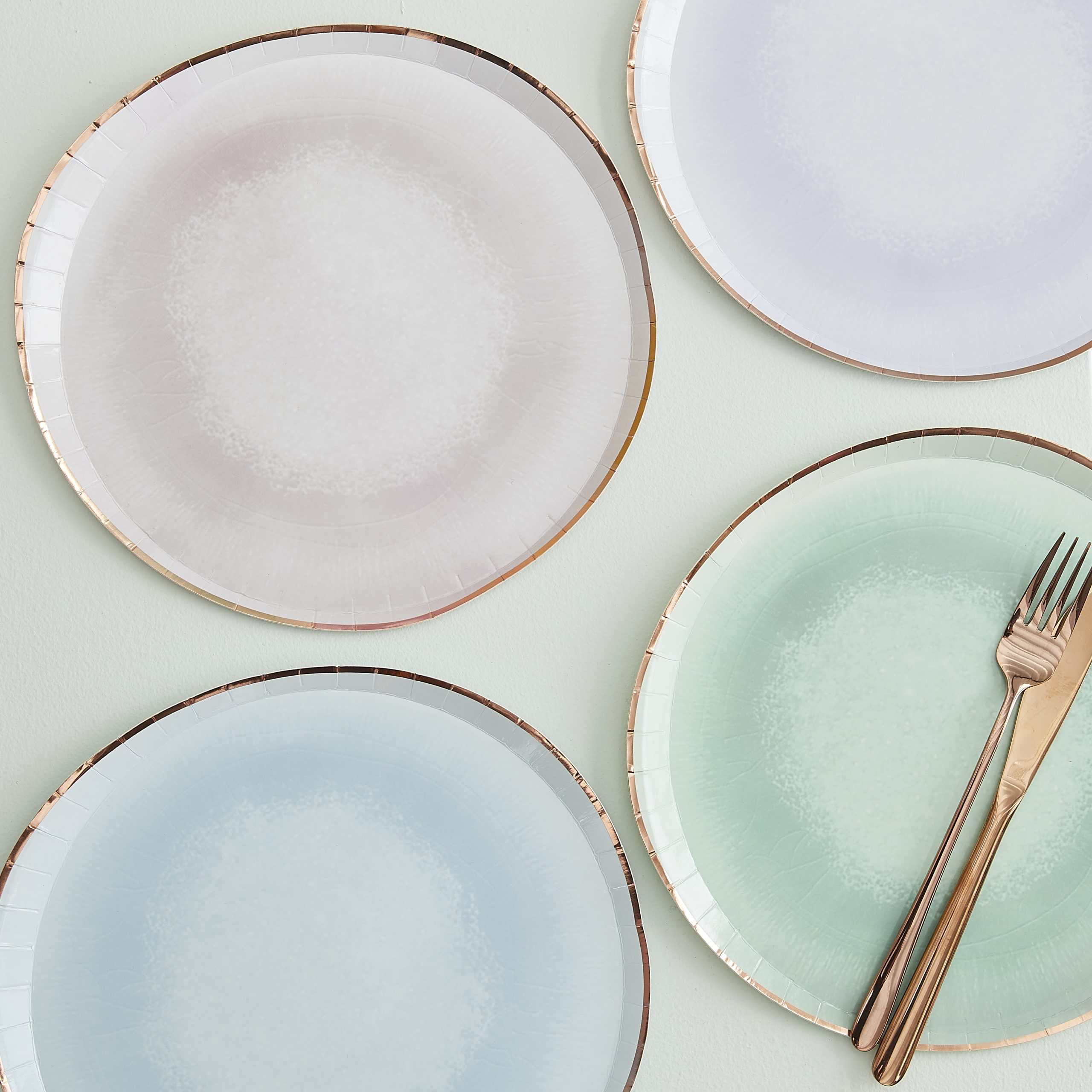 Each pack contains 8 Pastel and Rose Gold edged Paper Plates: