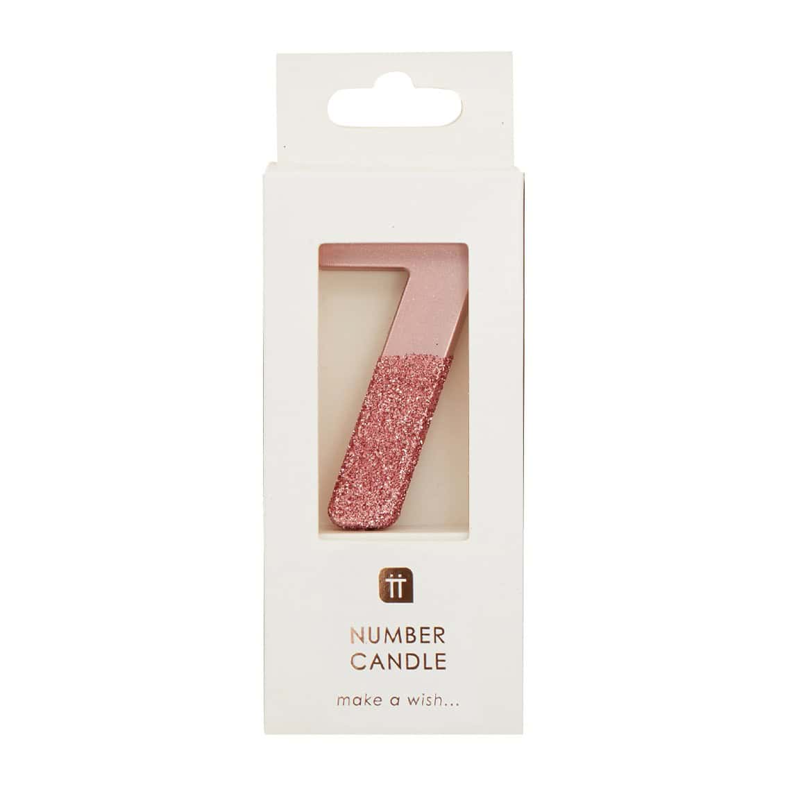 Rose Gold number 7 birthday candle dipped with glitter. Combine it with a 0 for milestone 70th birthdays!