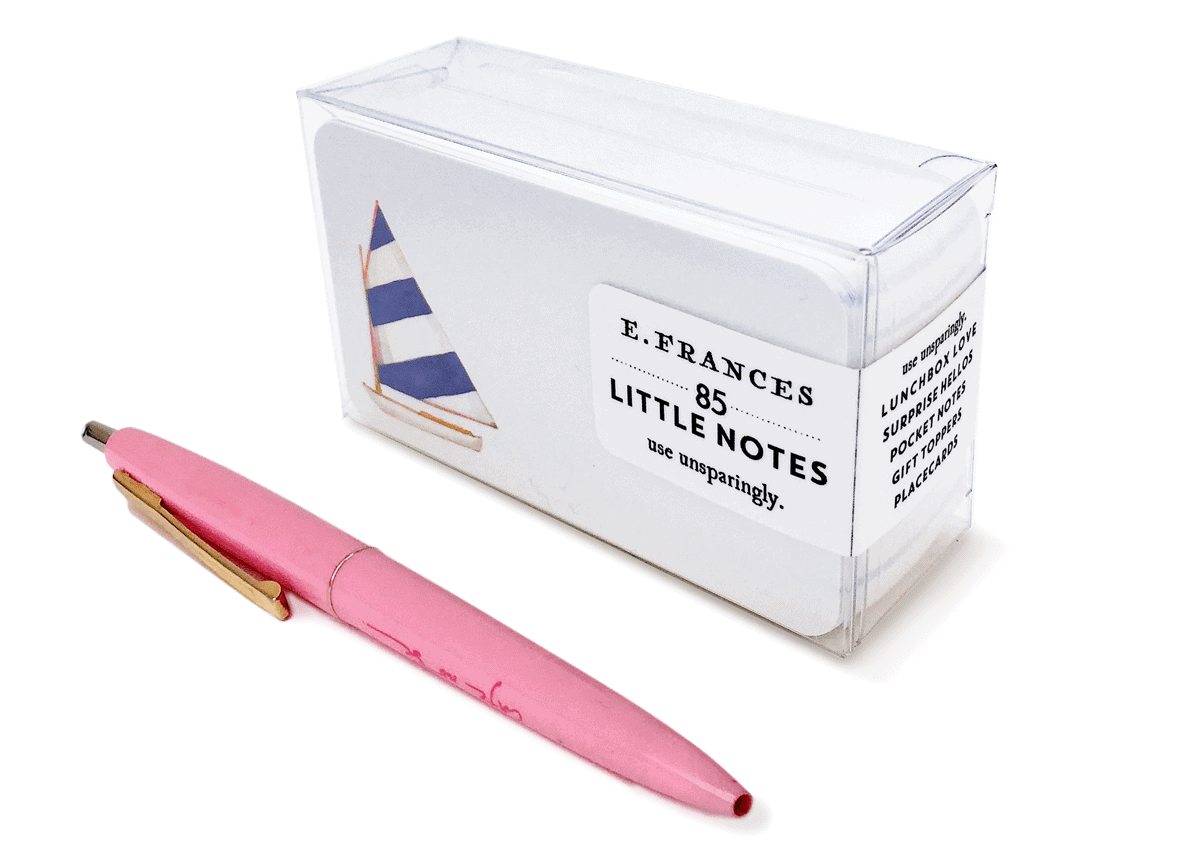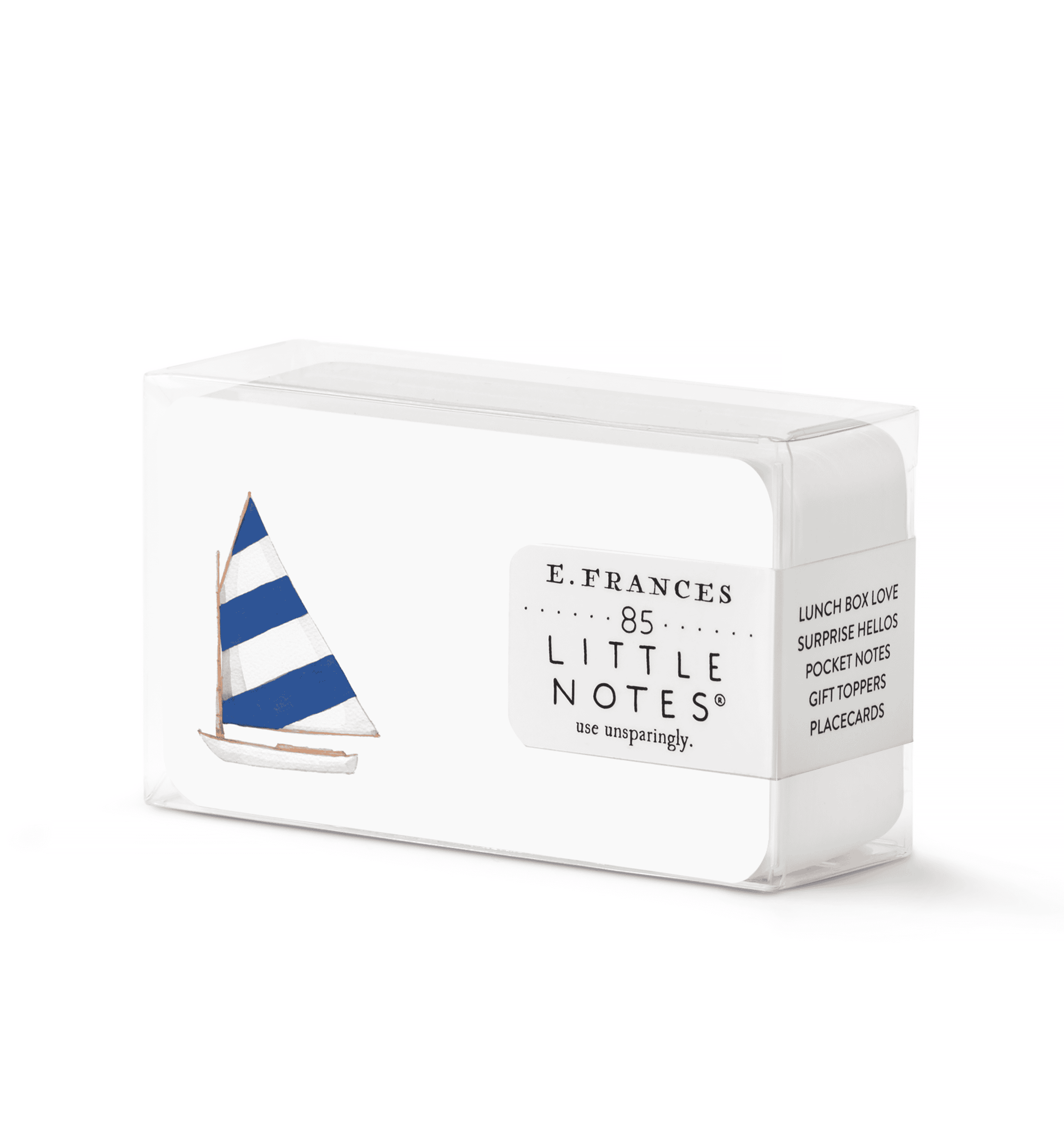 Eighty-five sailboat little note cards cozily boxed together for you to use unsparingly as place cards, surprise notes, lunchbox notes. Reverse has a complementary design