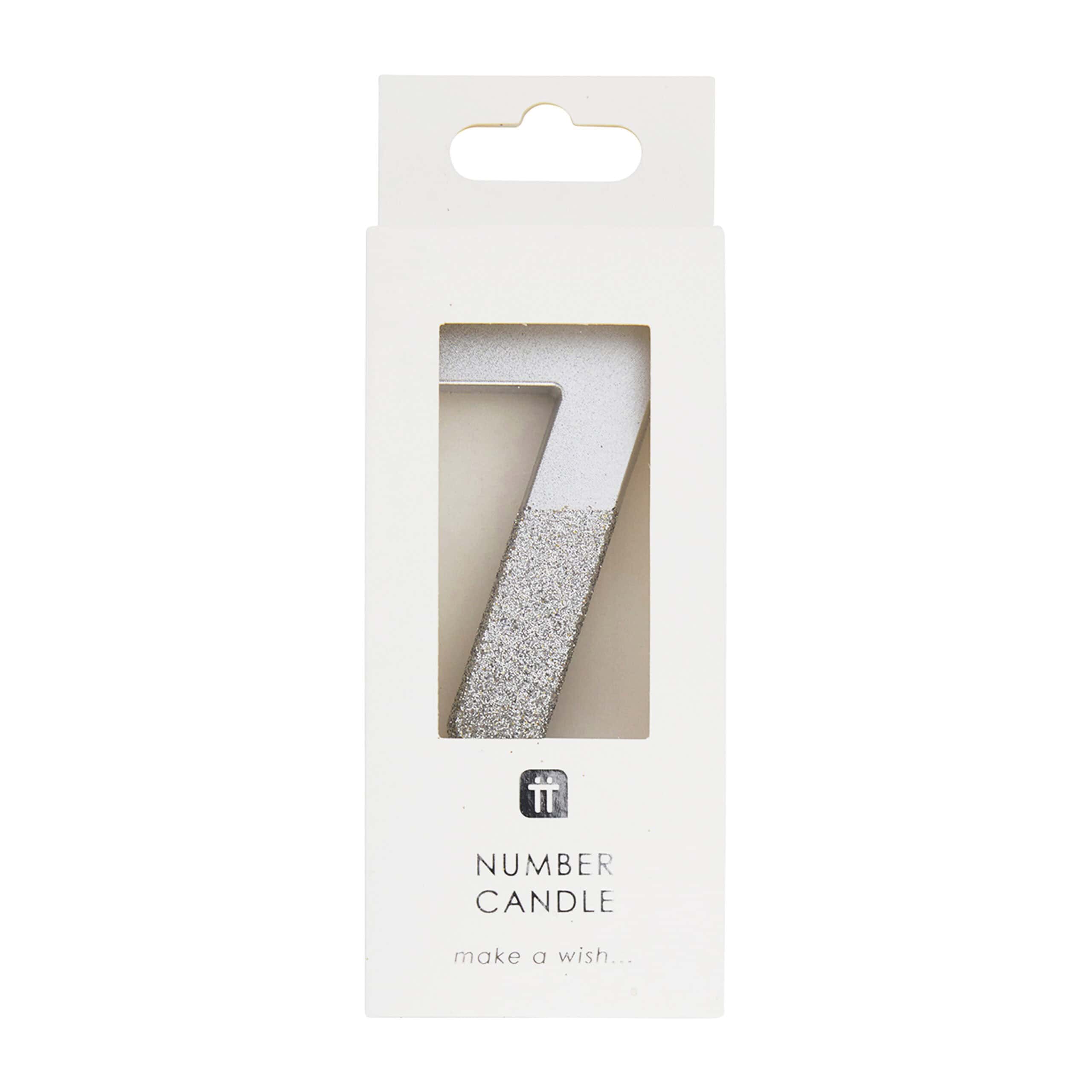 Silver number 7 birthday candle dipped with glitter