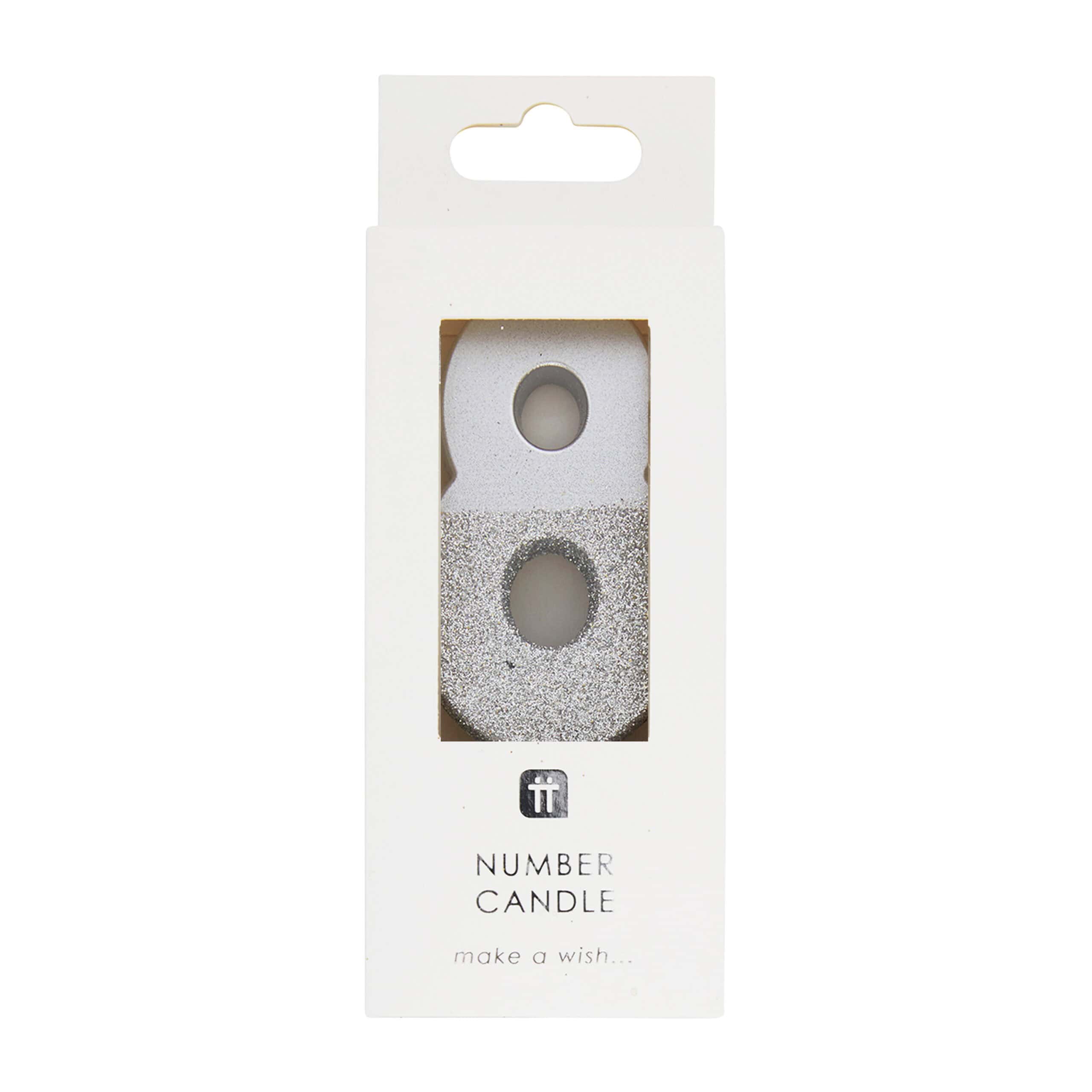 Silver number 8 birthday candle dipped with glitter. Combine it with a 0 for milestone 80th birthdays!